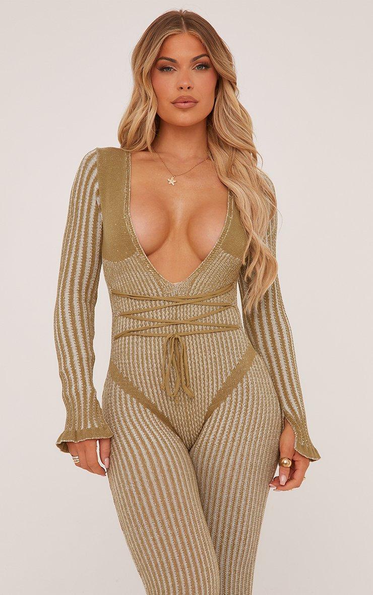 Long Sleeve Plunge Strappy Waist Detail Split Leg Jumpsuit In Contrast Olive Green Rib Knit