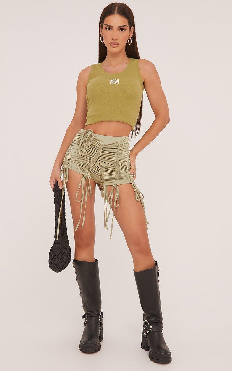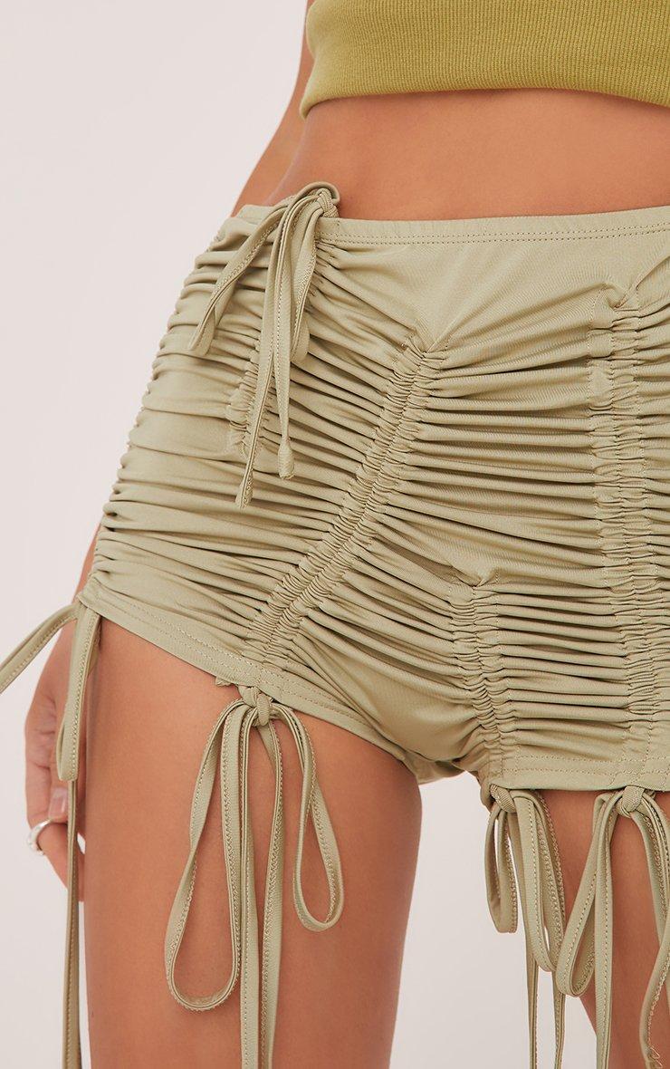 Mid Rise Ruched Detail Hotpant Shorts In Khaki Green Slinky