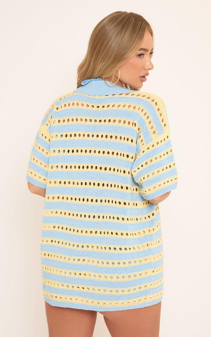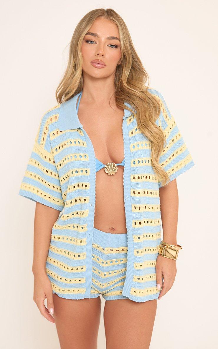 Short Sleeve Shirt In Blue And Yellow Stripe Crochet Knit