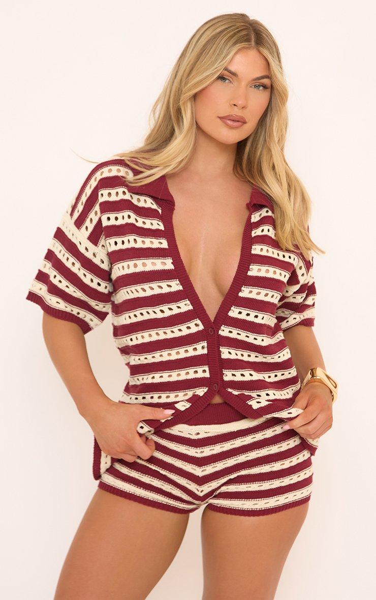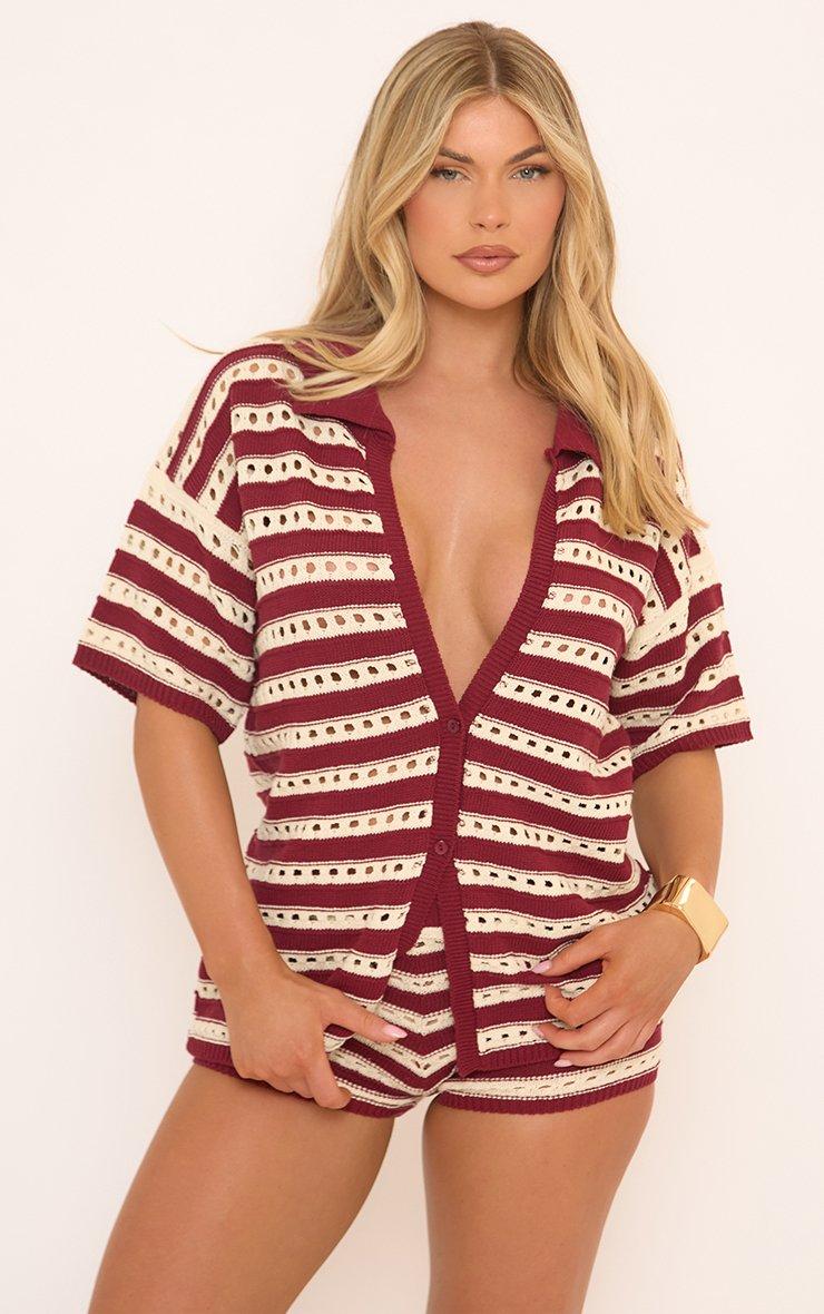 Short Sleeve Shirt In Burgundy And White Stripe Crochet Knit