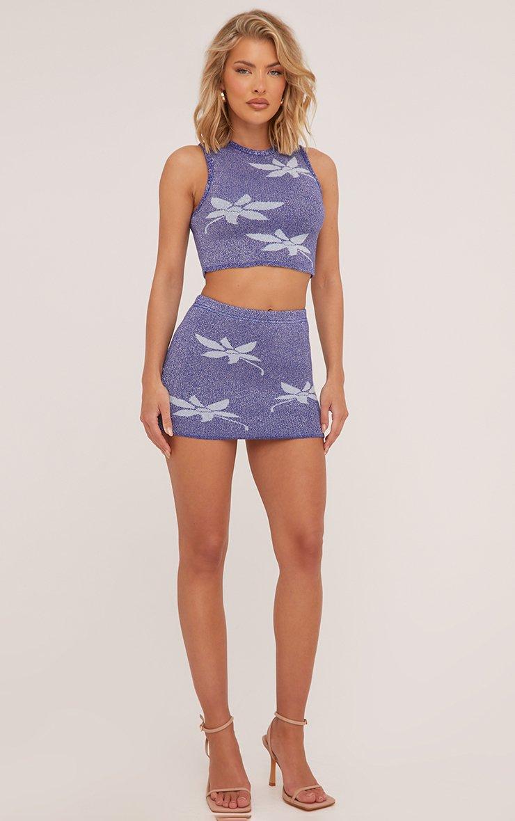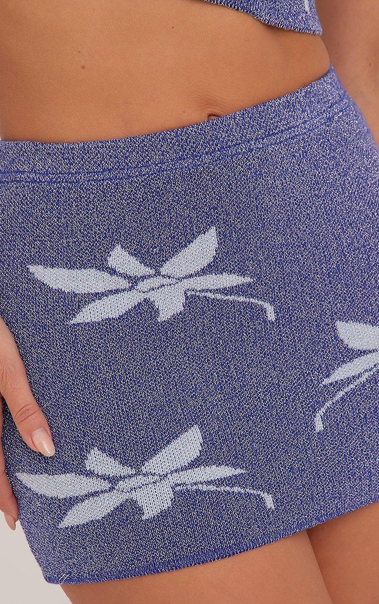 Low Rise Flower Print Mini Bodycon Skirt In Blue Glitter Knit