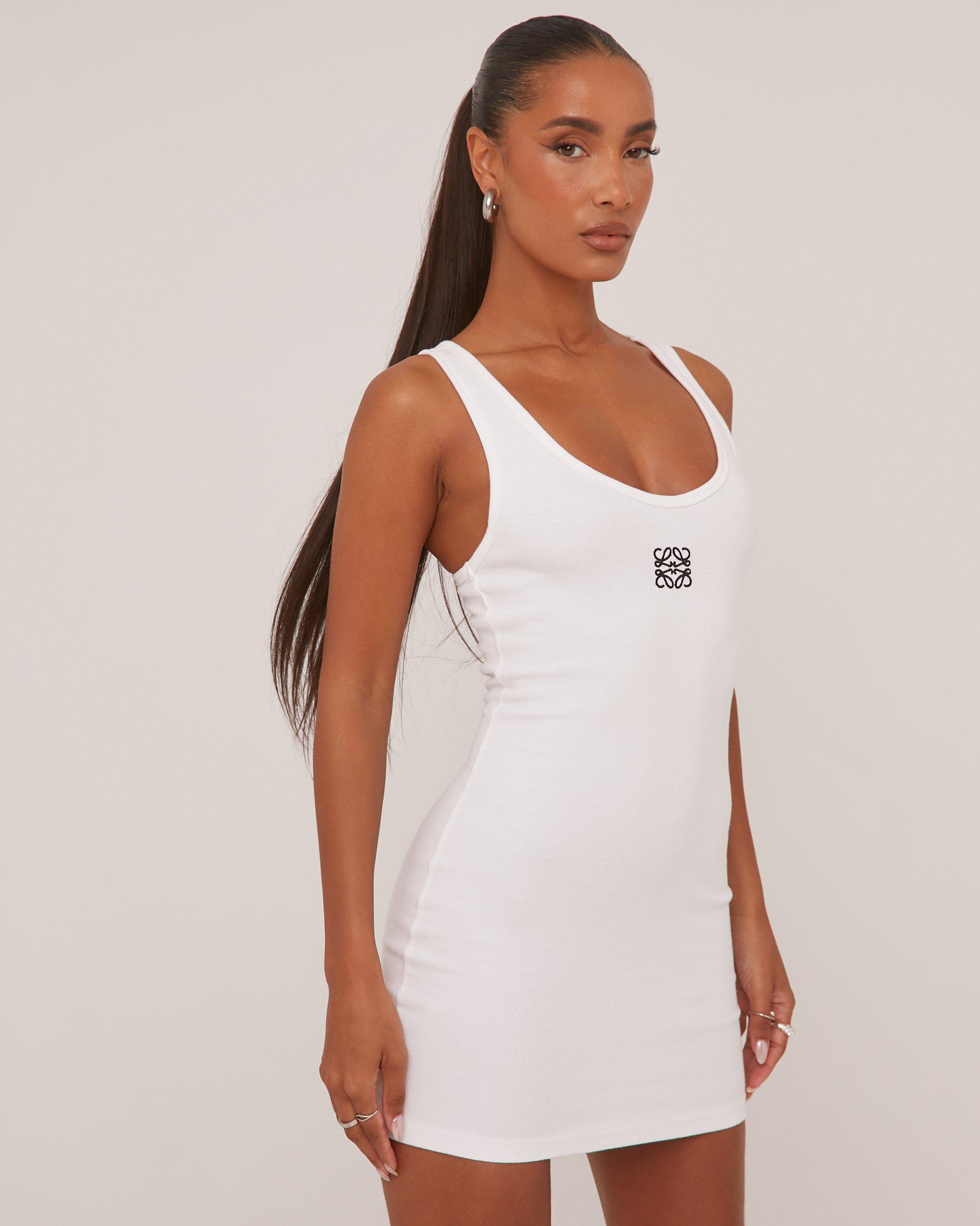 Scoop Neck Embroidered Swirl Detail Mini Bodycon Vest Dress In White Ribbed