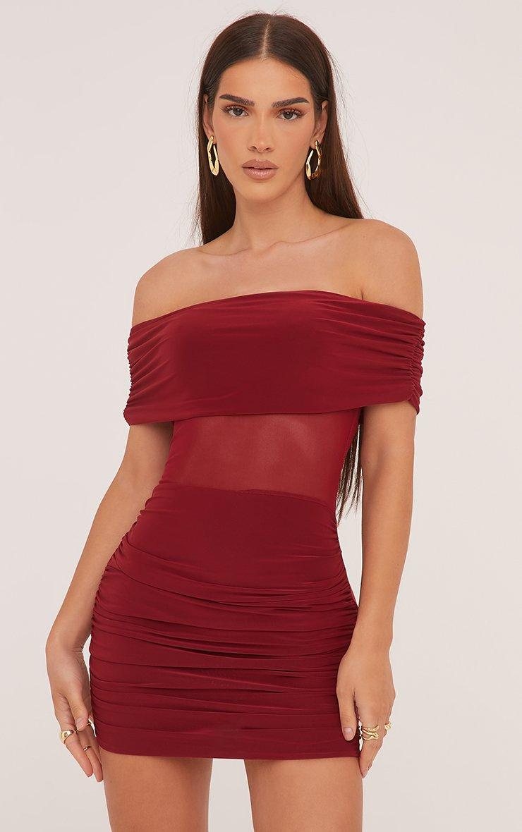 Fold Over Bardot Mesh Insert Mini Bodycon Dress In Dark Red Slinky
