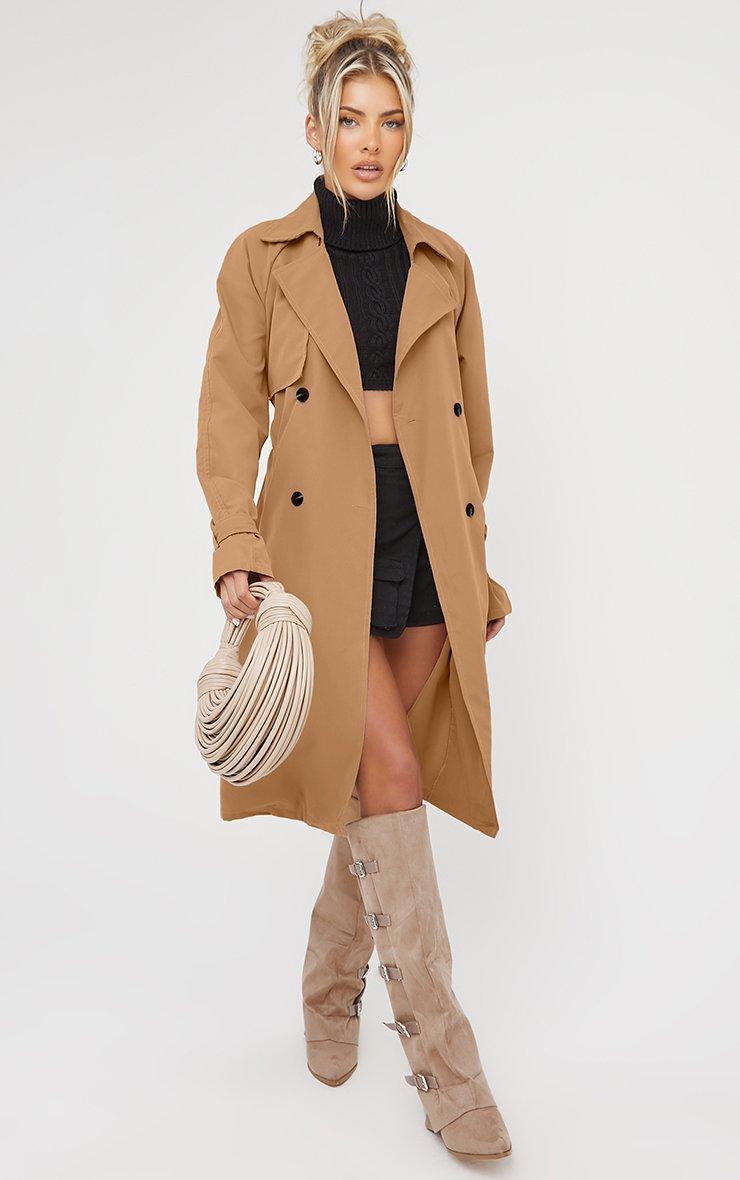 Everyone needs a staple trench coat to elevate any outfit. Featuring a stone material, an oversized fit and a mid length.