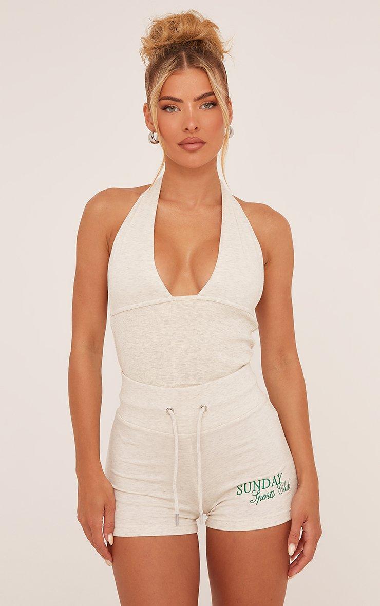 Plunge Halterneck Top In Beige Ribbed