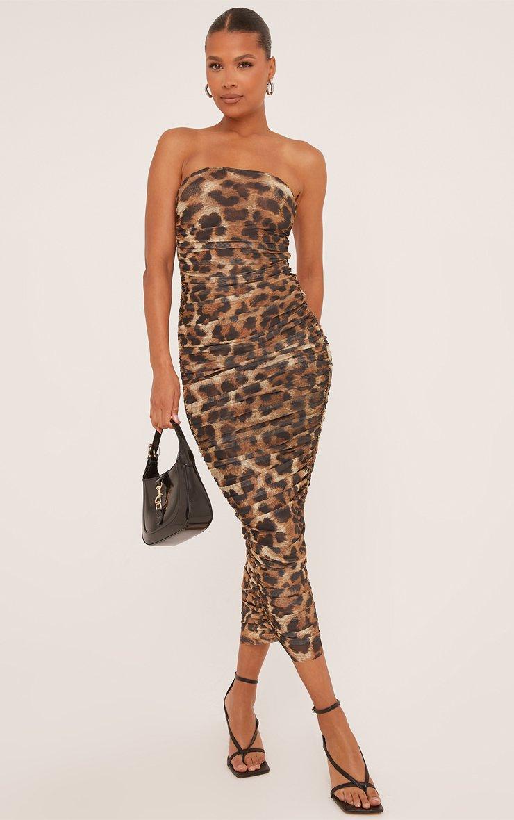 Bandeau Maxi Dress In Brown Leopard Print Slinky