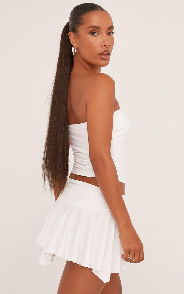 This co ord has minimalism with a little spice. Featuring a cream slinky material, s gem ring detail bandeau top and a pleated mini skirt.