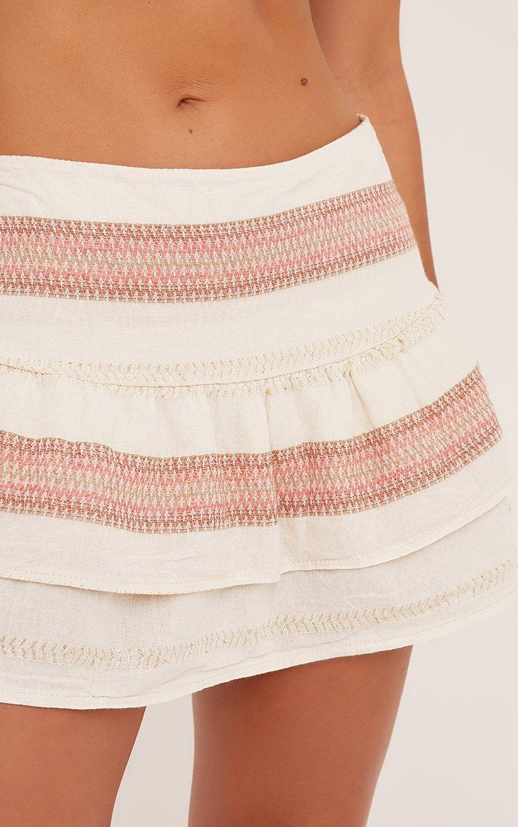Keep cool and full of style this season with this skirt. Featuring a beige stripe linen material, a low rise fit, a shirred tiered waist and a mini length.