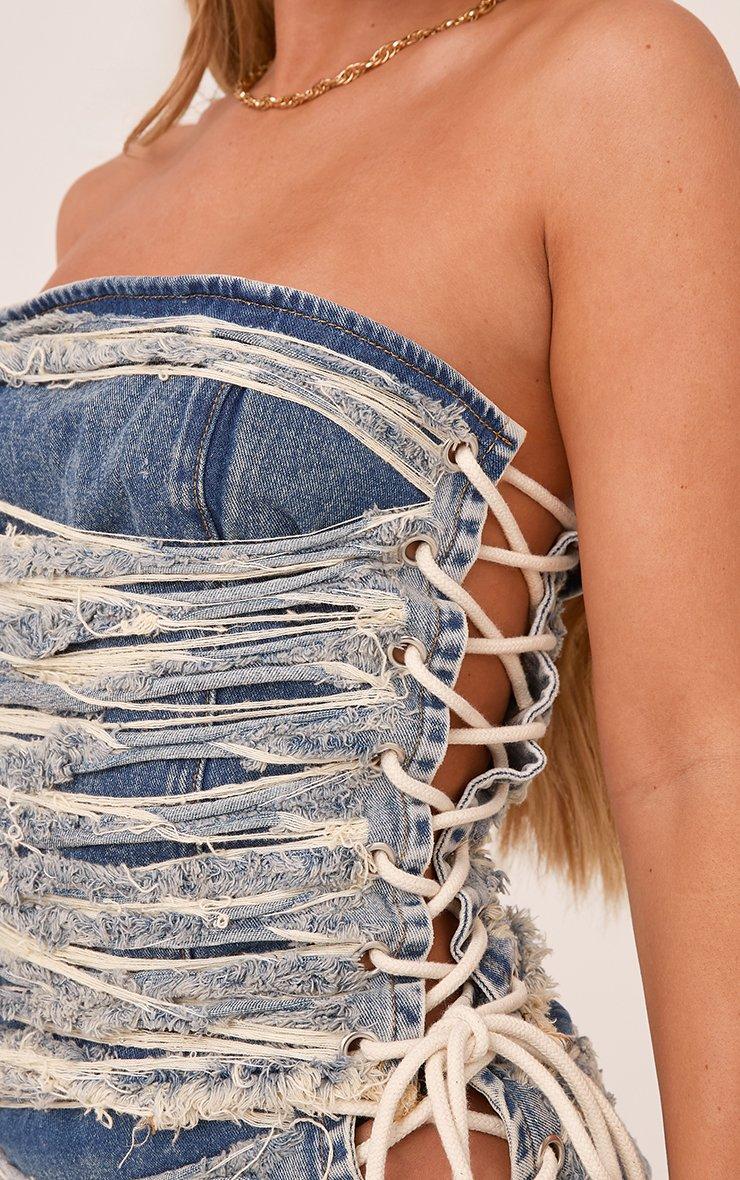Bandeau Distressed Detail Lace Up Side Top In Blue Denim