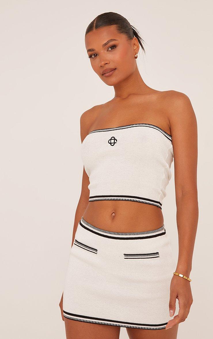 We are loving the knit on this skirt. Featuring a white knit material, a low rise fit, contrast binding and a mini length.