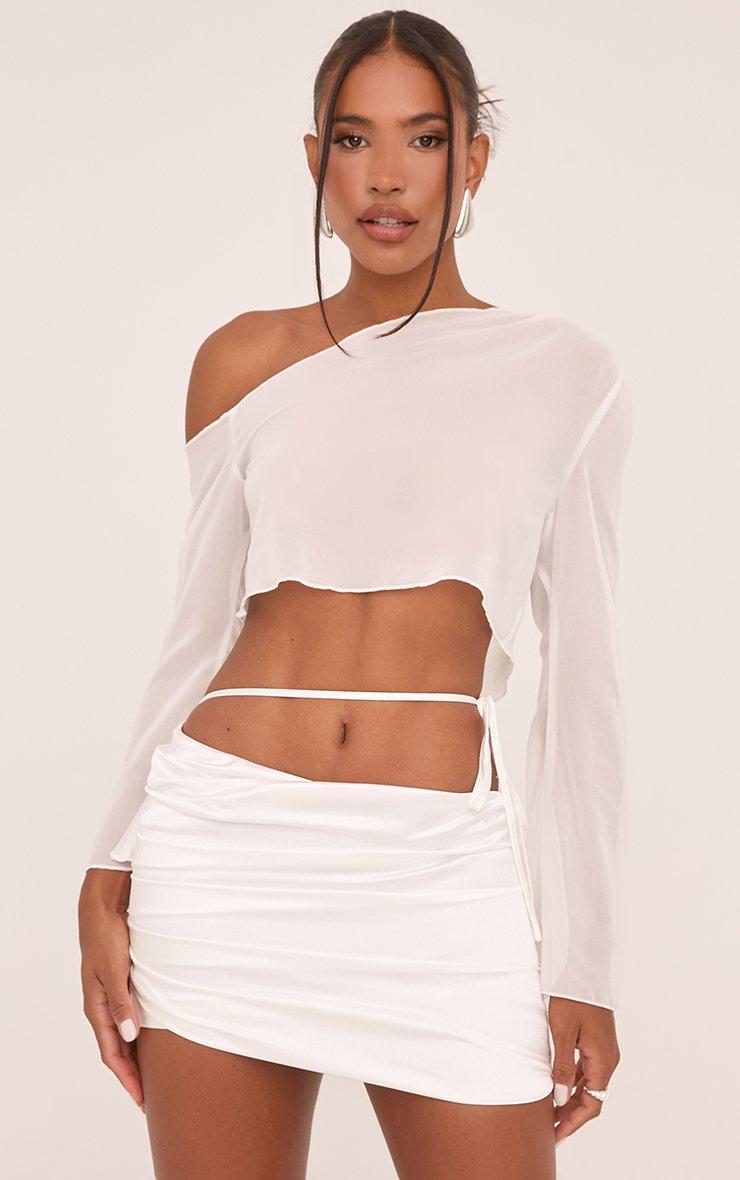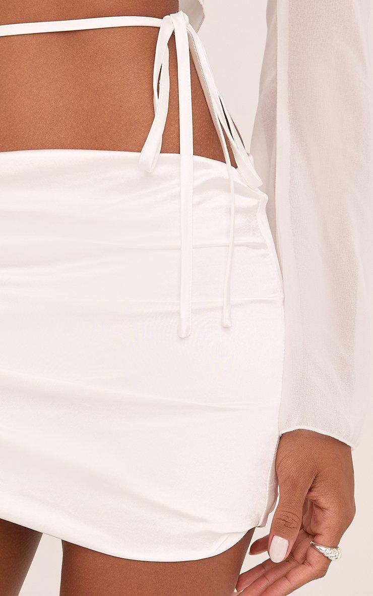 Low Rise Strappy Tie Side Ruched Asymmetric Mini Skirt In White Satin