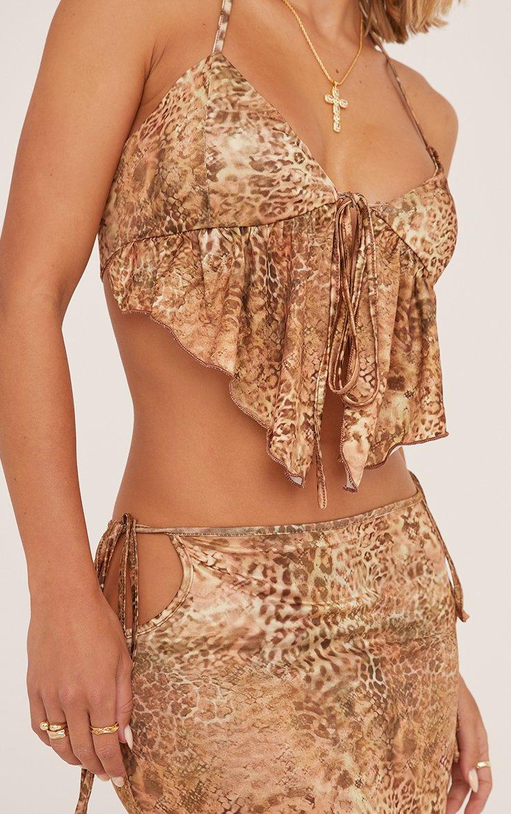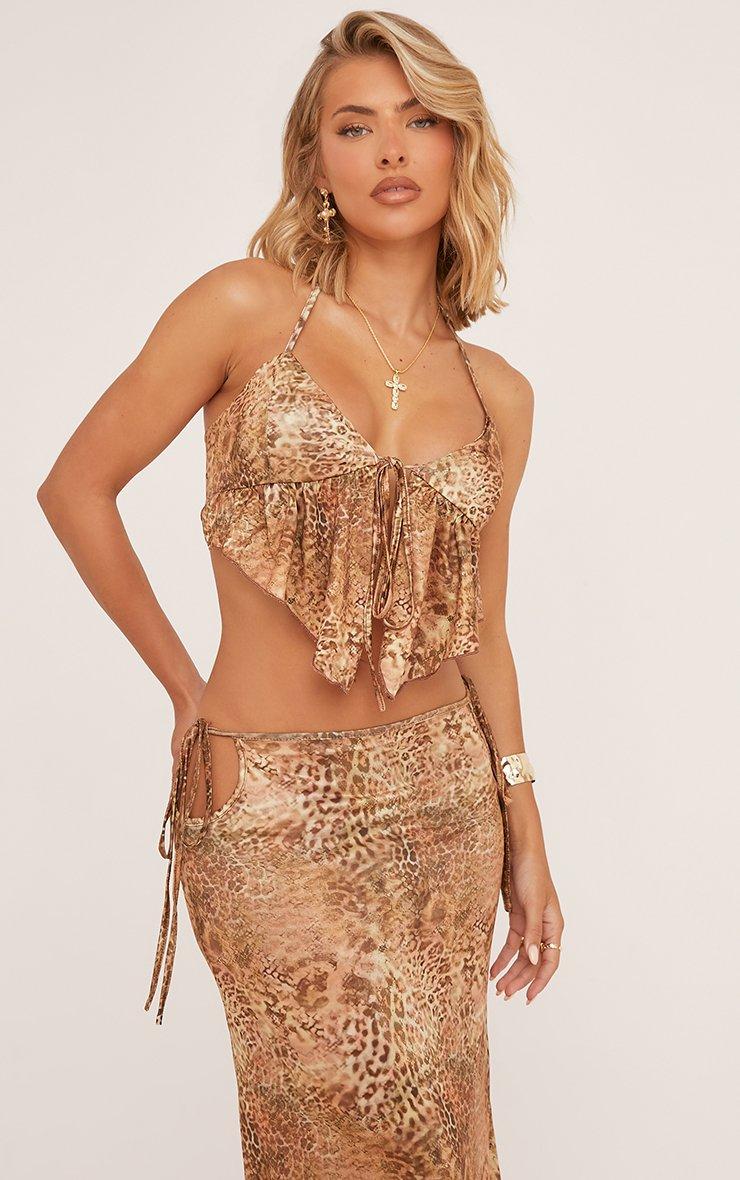 Tie Front Split Hem Crop Top And Tie Side Maxi Skirt Co-Ord Set In Leopard Print Slinky