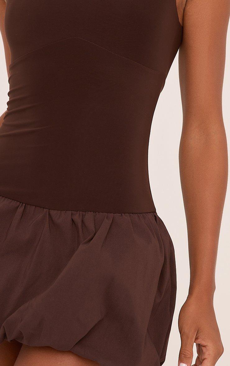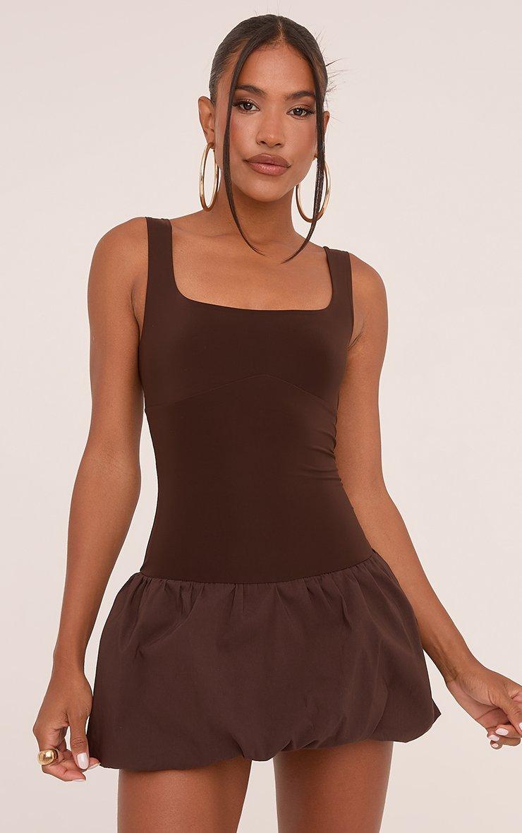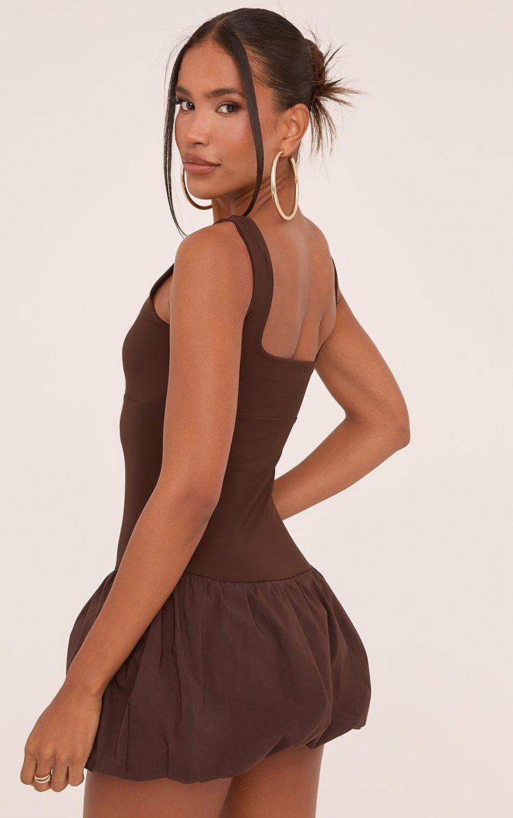 This is the perfect versatile pick for your summer days. Featuring a chocolate material, scoop neck, a puffball design and a mini length.
