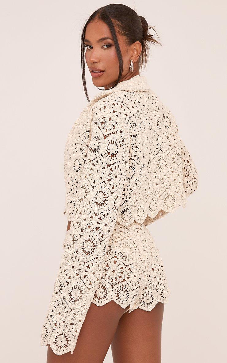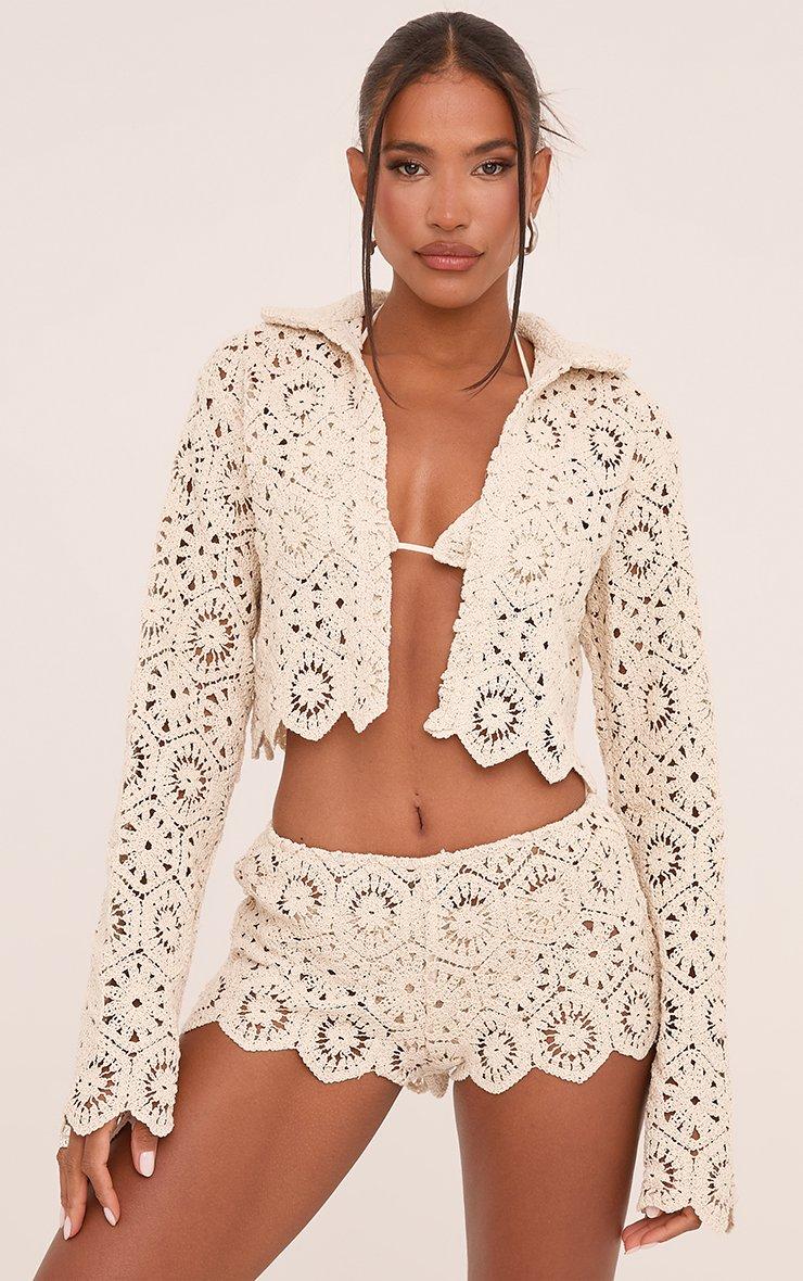 Low Rise Micro Shorts In Stone Crochet Knit