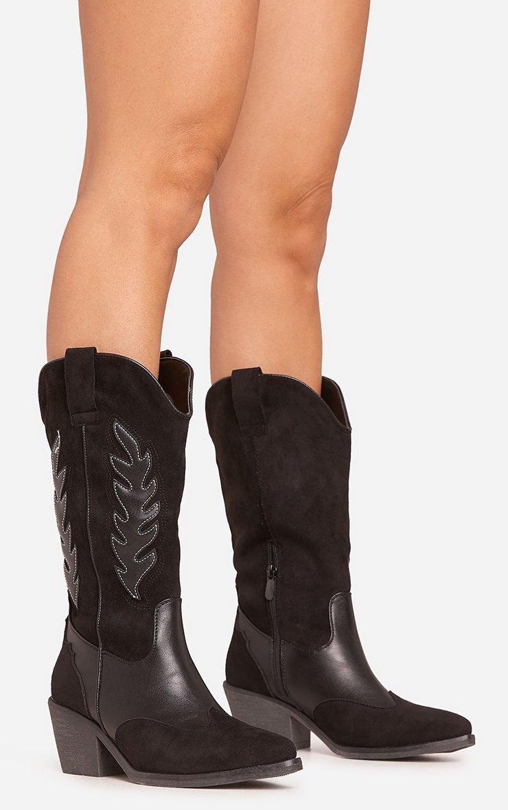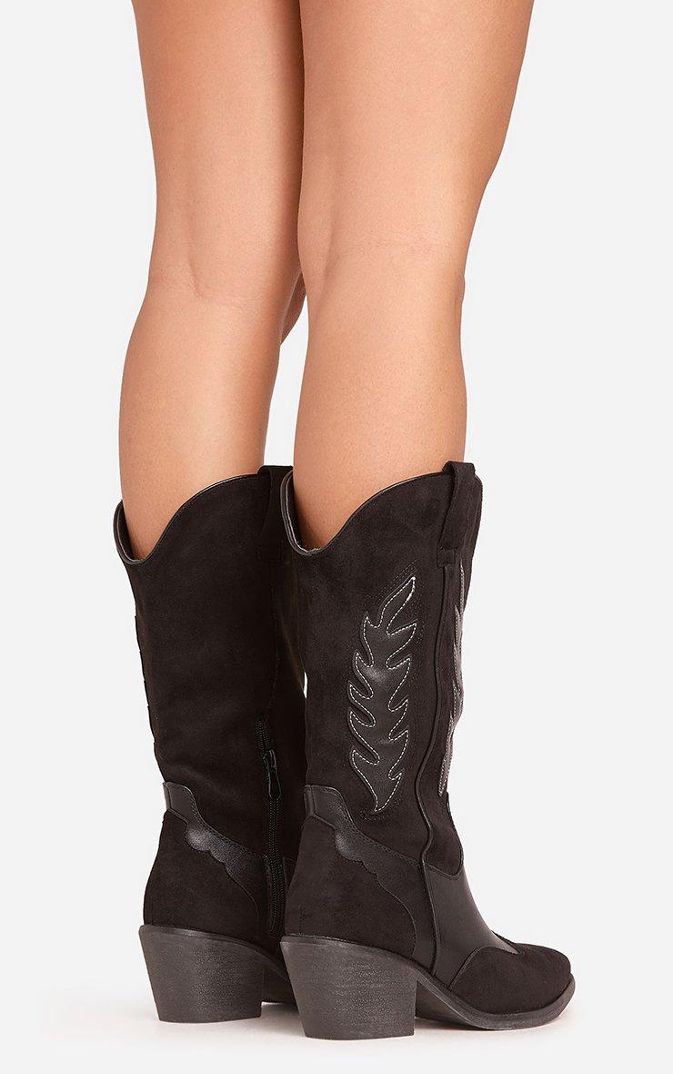 Sparrow Embroidered Detail Pointed Toe Mid Calf Western Cowboy Boot In Black Faux Leather
