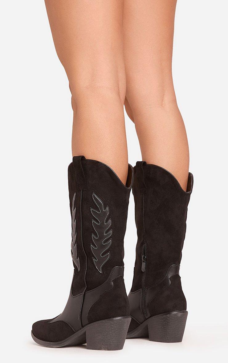 Turn heads with this season's trending black western boots. From date night to the dancefloor, elevate your look with the Sparrow Embroidered Detail Pointed Toe Mid Calf Western Cowboy Boots In Black Faux Leather. Dress for a summer to remember with the EGO collection of cowboy boots.