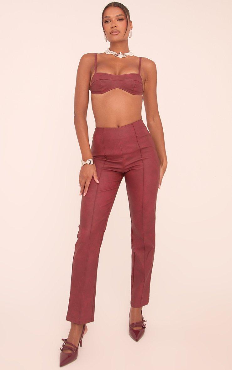 Slay the night away with this Strappy Cropped Bralet Top In Washed Plum Faux Leather! This bralet crop top stands out from the crowd with it's washed plum faux leather material and strappy style. Unleash your flirty side with it's cropped length and figure hugging fit. Team this bralet top with the matching trousers and heels for a look to make them stare.