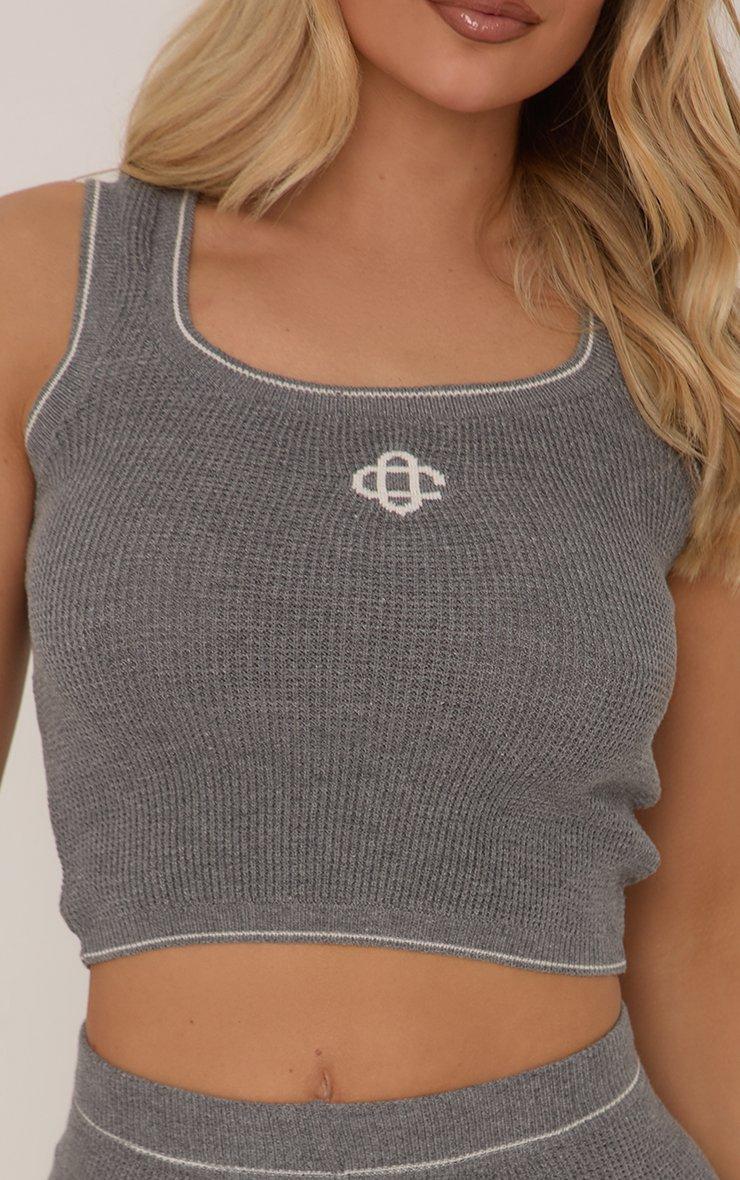 Chill in style with our Scoop Neck Logo Detail Vest Top In Grey Waffle Knit. This grey knitted vest top is your everyday fave with its chic scoop neck, luxe logo detail and dreamy waffle knit. Style this vest top with the matching trousers for a cute and comfy vibe.