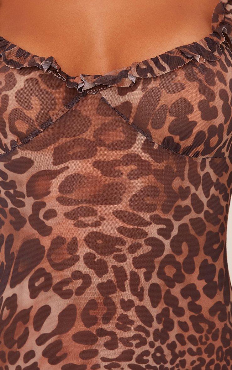 Strappy Frill Edge Mini Dress In Brown Leopard Print Mesh