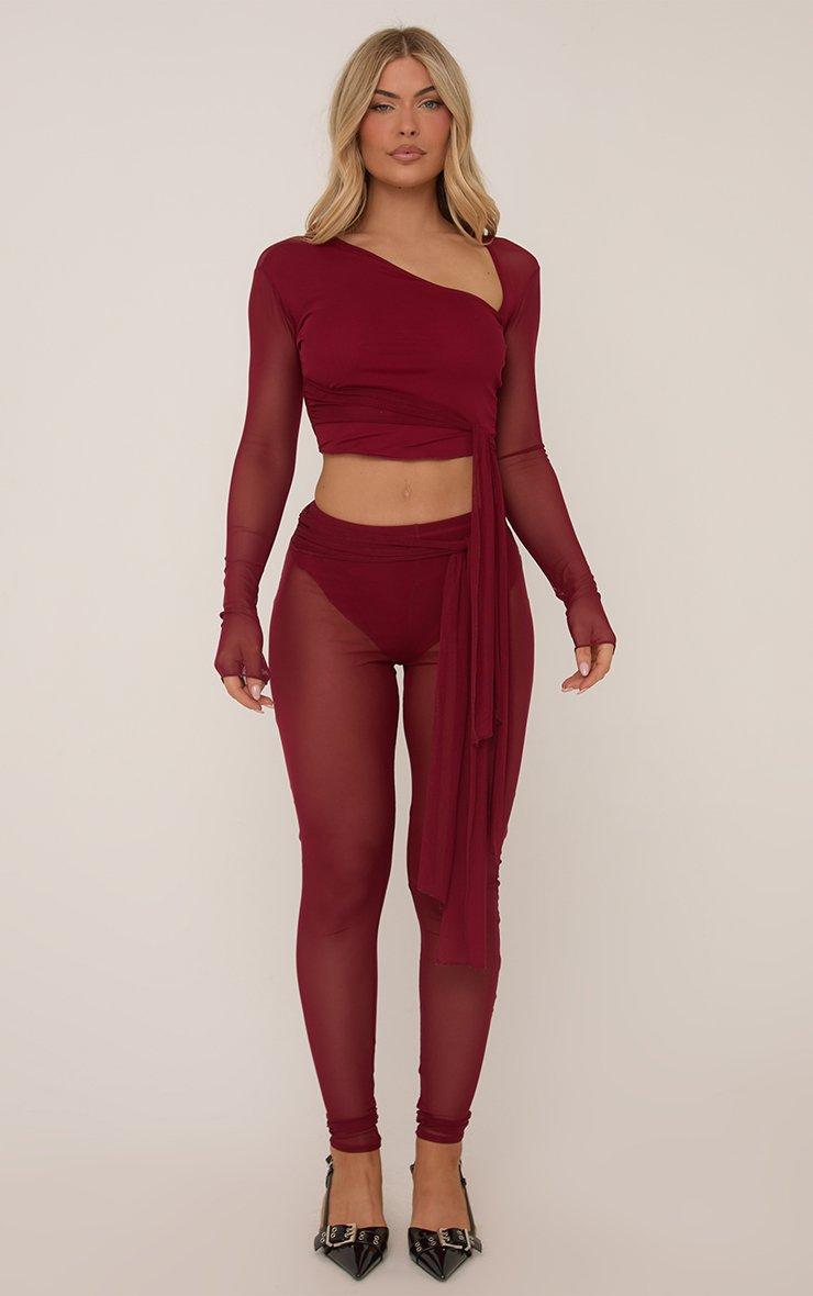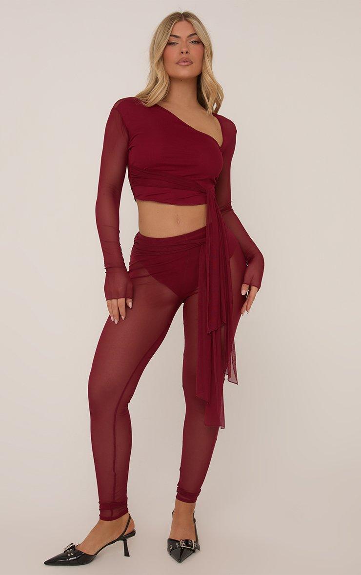 Low Rise Tie Side Detail Knicker Insert Leggings In Burgundy Mesh