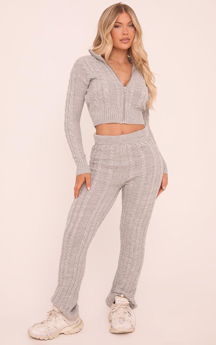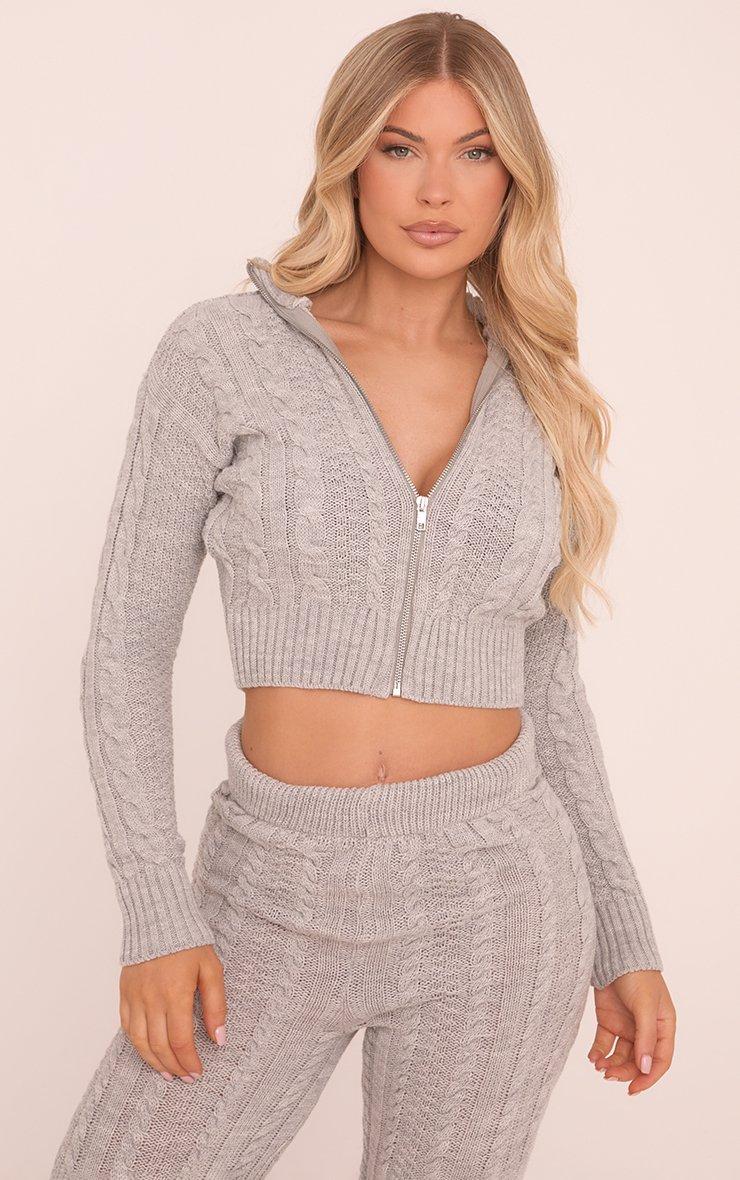 Nail off-duty style with this Zip Up Cropped Cardigan In Grey Cable Knit. This cropped zip cardigan is the ultimate low-key look with its cosy grey cable knit and sleek zip up style. Designed for chill days, pair this cropped cardigan with the matching knitted trousers for a fierce and foolproof fit!