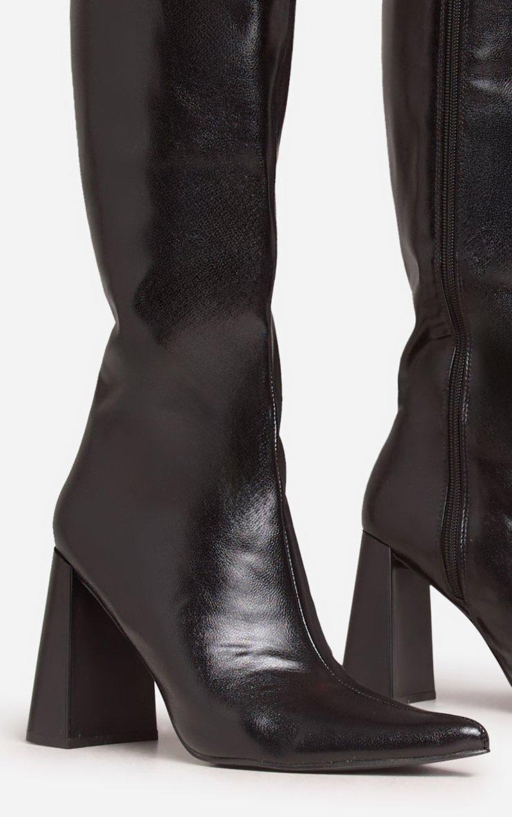 Thatcher Pointed Toe Block Heel Knee High Long Boot In Black Faux Leather