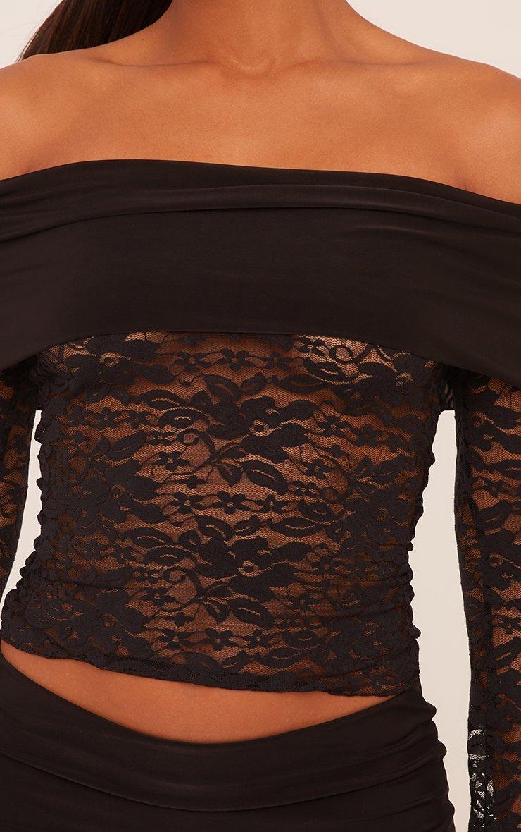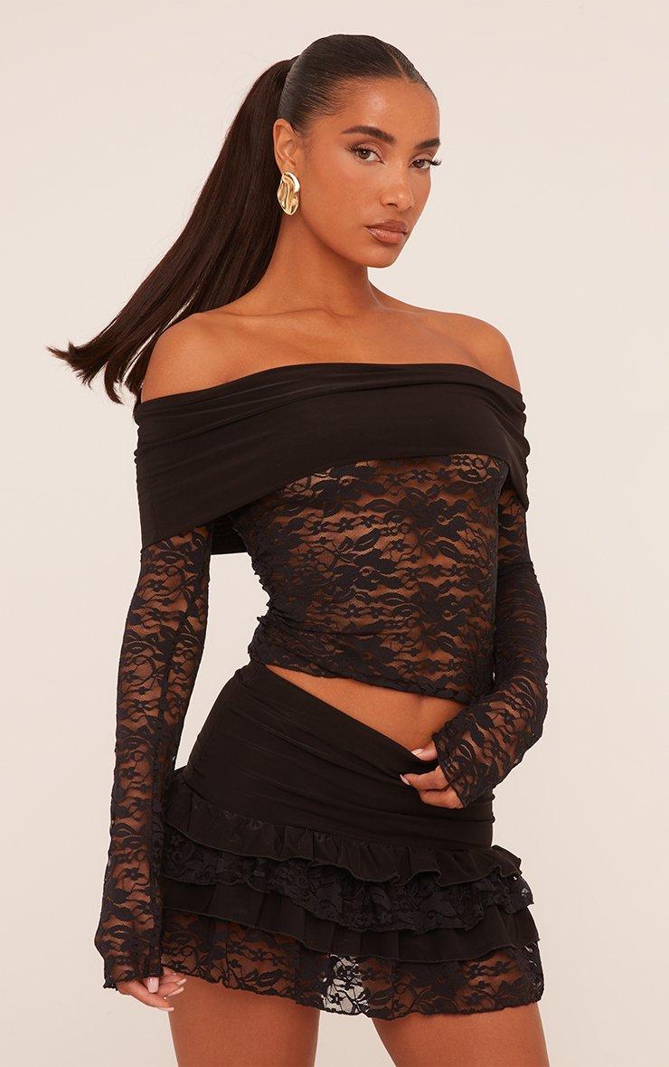 Slinky Fold Over Bardot Top In Black Lace