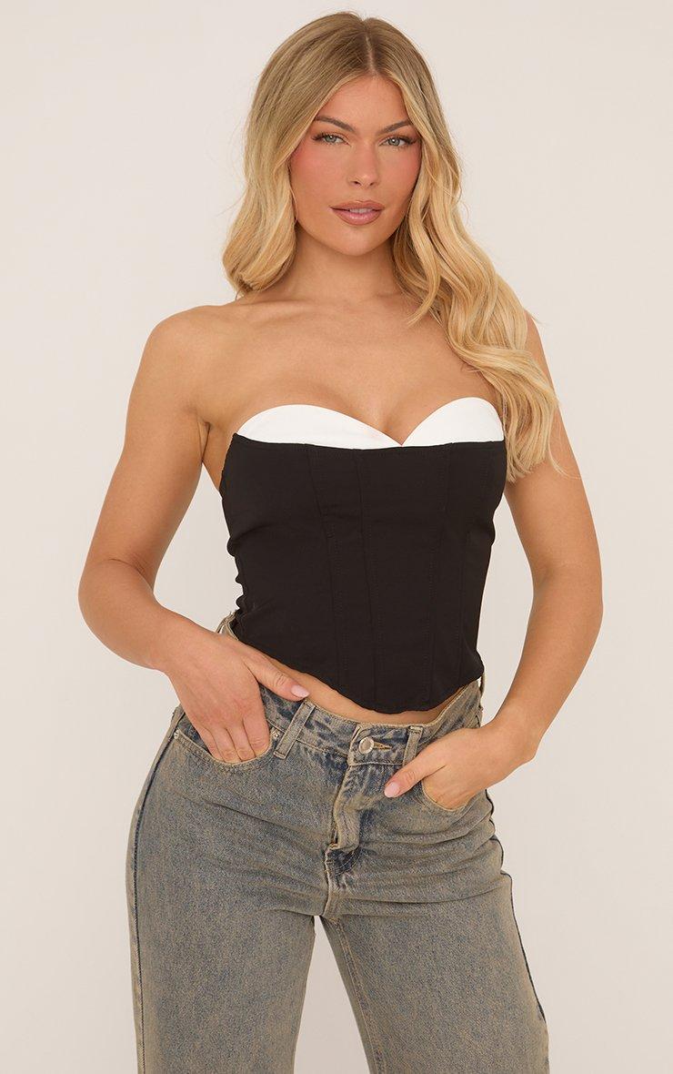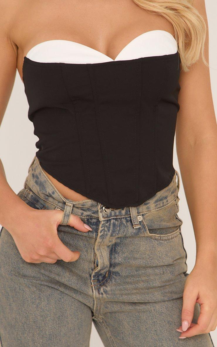 Ready to slay, babe? This bandeau contrast trim corset top in black is all about giving you that killer silhouette. Featuring a sleek corset fit and bold contrast trim, it’s the ultimate top to pair with high-waisted jeans or a mini skirt.