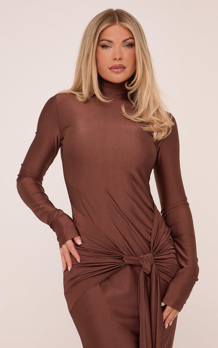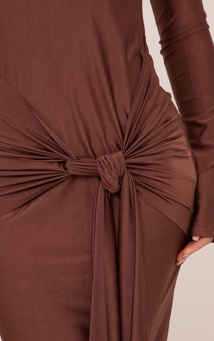 Long Sleeve High Neck Drape Waist Detail Maxi Dress In Chocolate Brown Slinky