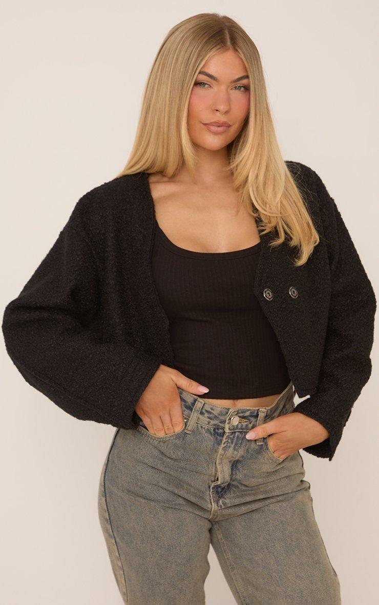 Asymmetric Button Front Cropped Jacket In Black Faux Wool