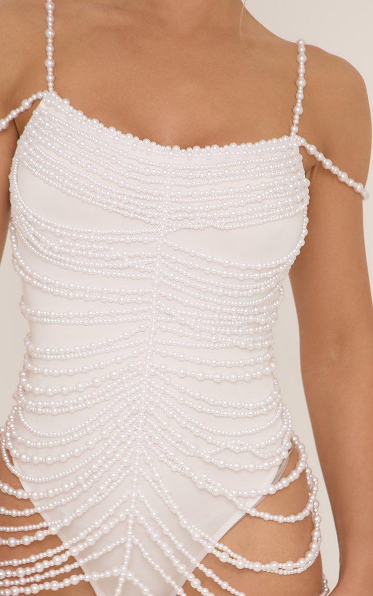 Enter your luxe era with our Strappy Scoop Neck Bodysuit Lining Mini Dress In White Pearl. This pearl beaded mini dress is dripping in drama with its delicate straps, flattering scoop neck and mesmerizing white pearls. Plus, the bodysuit lining gives you a flawless fit. Slip into this eye-catching mini dress for those unforgettable nights.