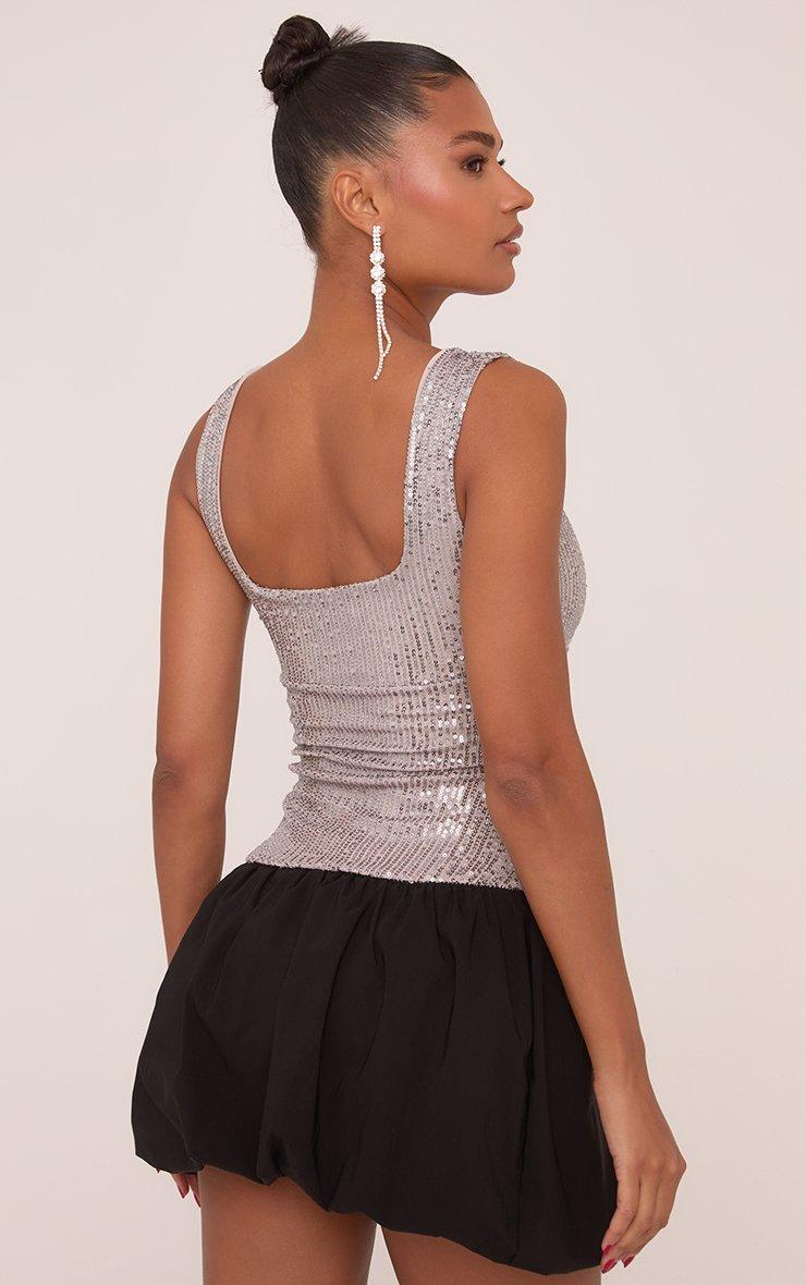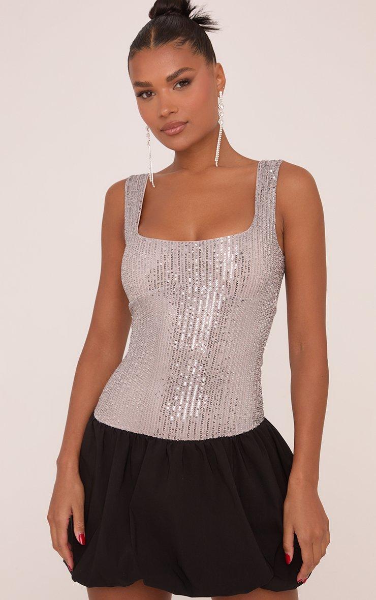 Serve looks all night long in this Square Neck Puffball Mini Dress in Silver Sequin. This puffball mini dress blends chic and sparkly with its square neck, black bubble skirt and dazzling silver sequins. Slip into this mini dress and spend all night sparkling under disco lights!