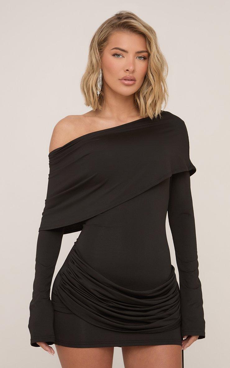 Asymmetric Bardot Drape Detail Mini Bodycon Dress In Black Slinky