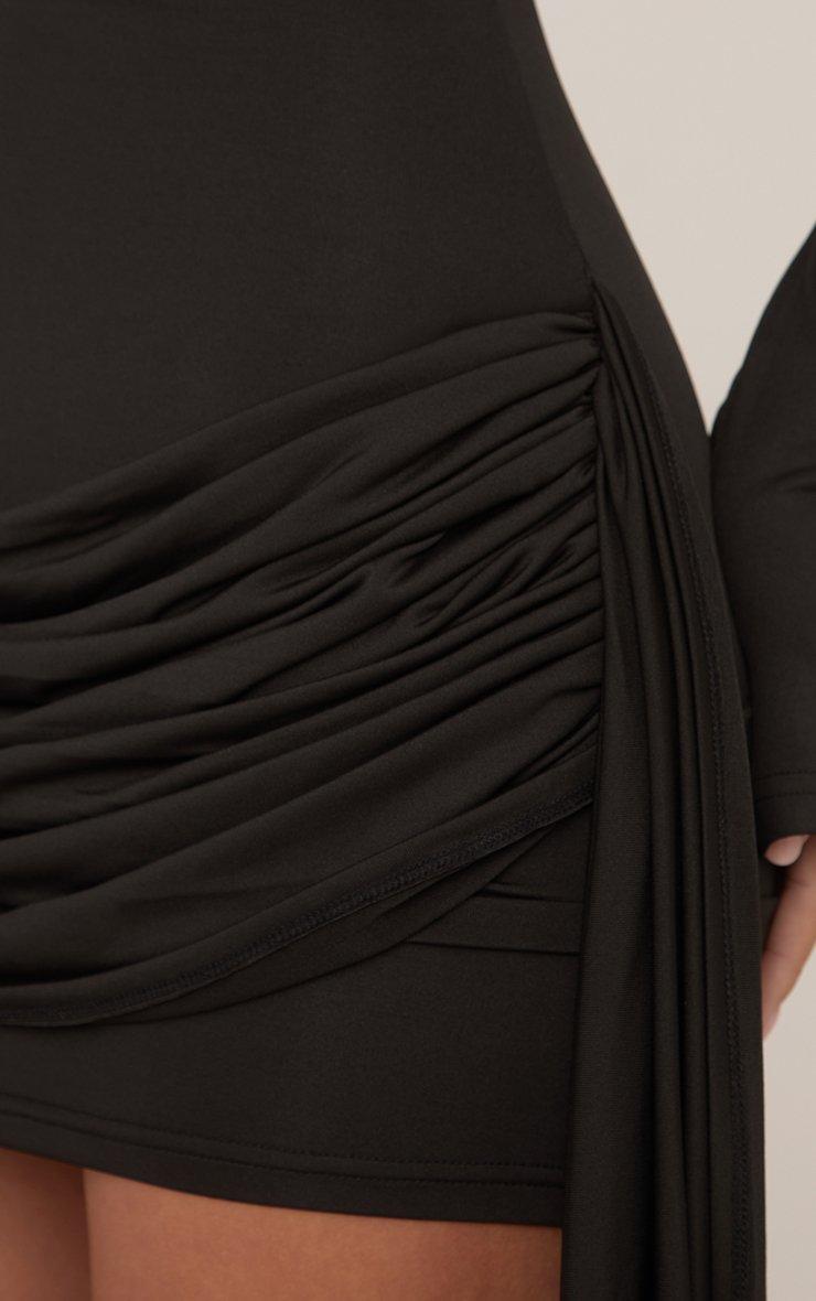 Get ready to steal the show in the Asymmetric Bardot Drape Detail Mini Bodycon Dress in Black Slinky! This black slinky bodycon dress features an asymmetric Bardot neckline and glam drape detail that perfectly balances the flirty mini length. Whether you're headed to a party or a special night out, this bodycon dress promises to make a bold and stylish statement.