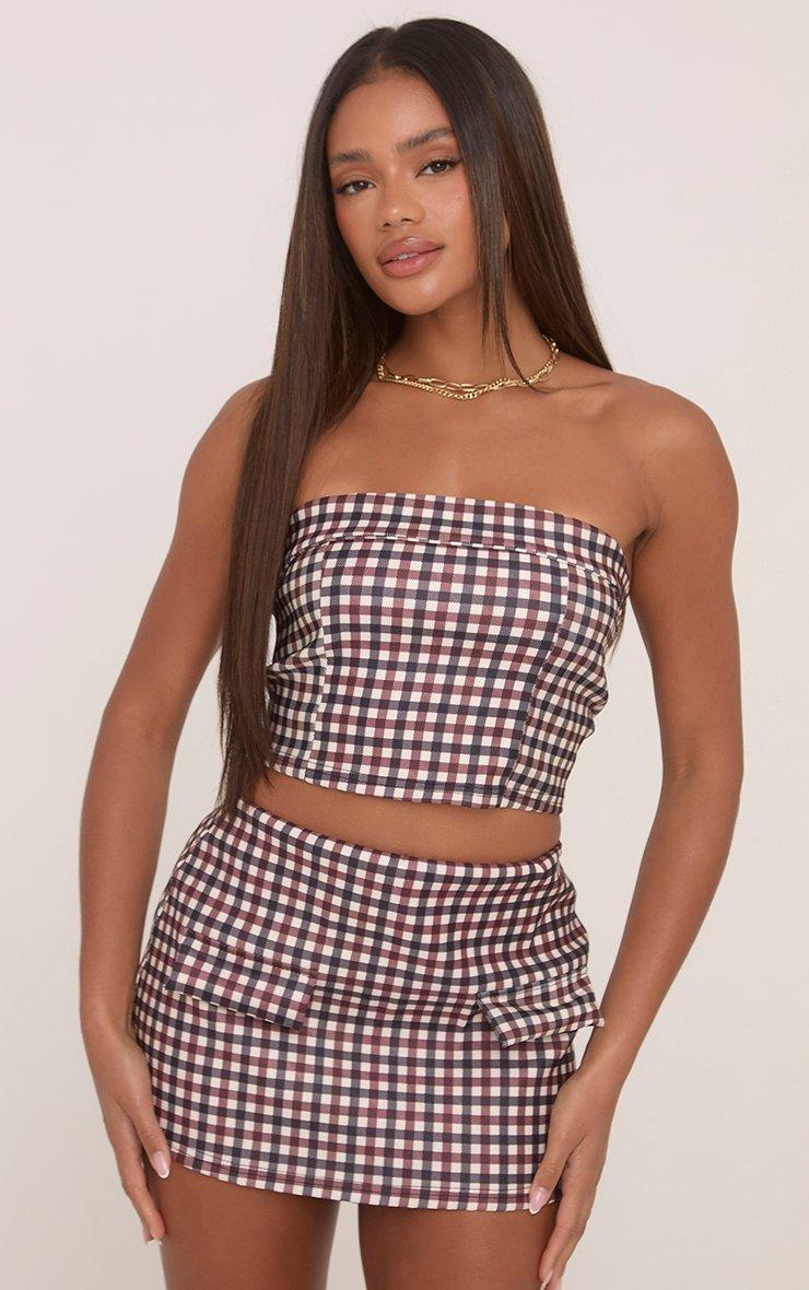 Severe AW style in our High Waist Pocket Detail Mini Bodycon Skirt In Brown Check Print. This brown check mini skirt gives the perfect preppy vibe with its high waist fit and chic pocket details. Pair this bodycon skirt with the matching check top for a fierce fall fit!