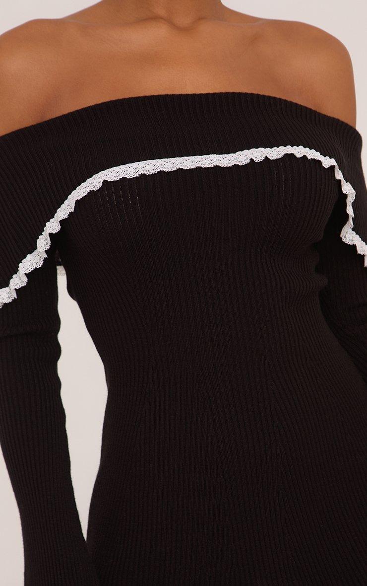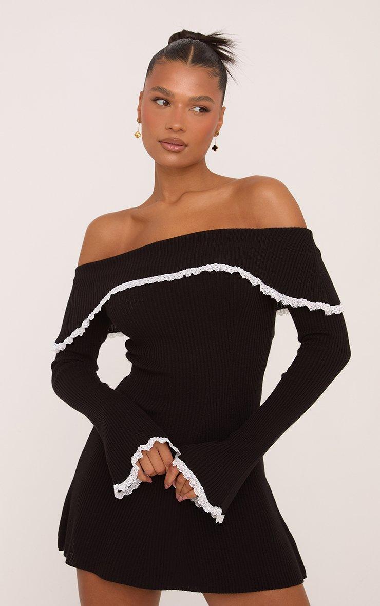 Look all kinds of chic in our Bardot Lace Trim Flippy Hem Mini Dress In Black Knit. This black bardot knit dress is pure elegance with its delicate white lace trim and flippy hem. Crafted in a black knit, this mini dress is serving iconic looks day or night!