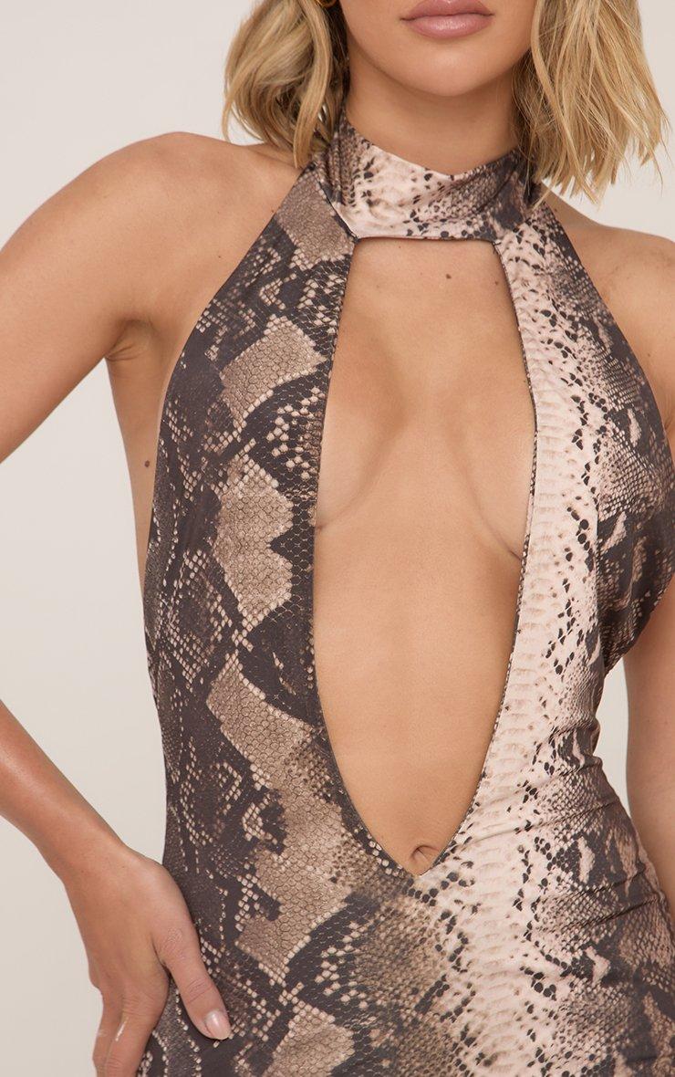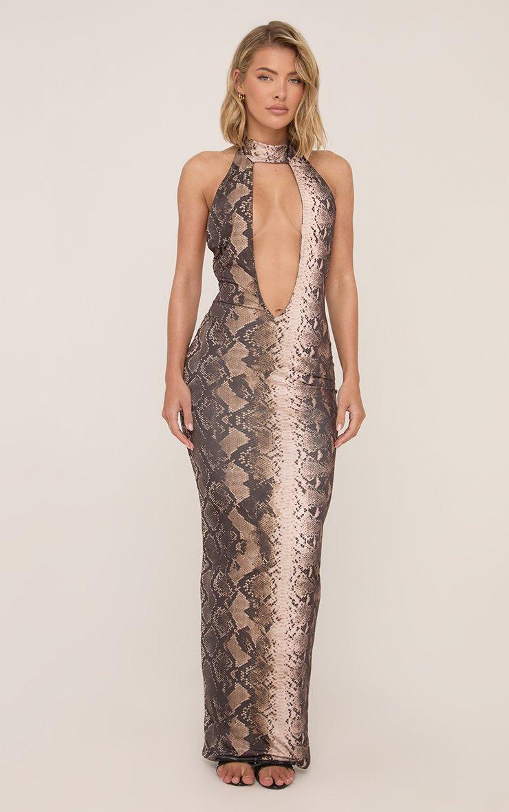 Sleeveless Plunge Cut Out Front Snake Print Maxi Dress In Brown