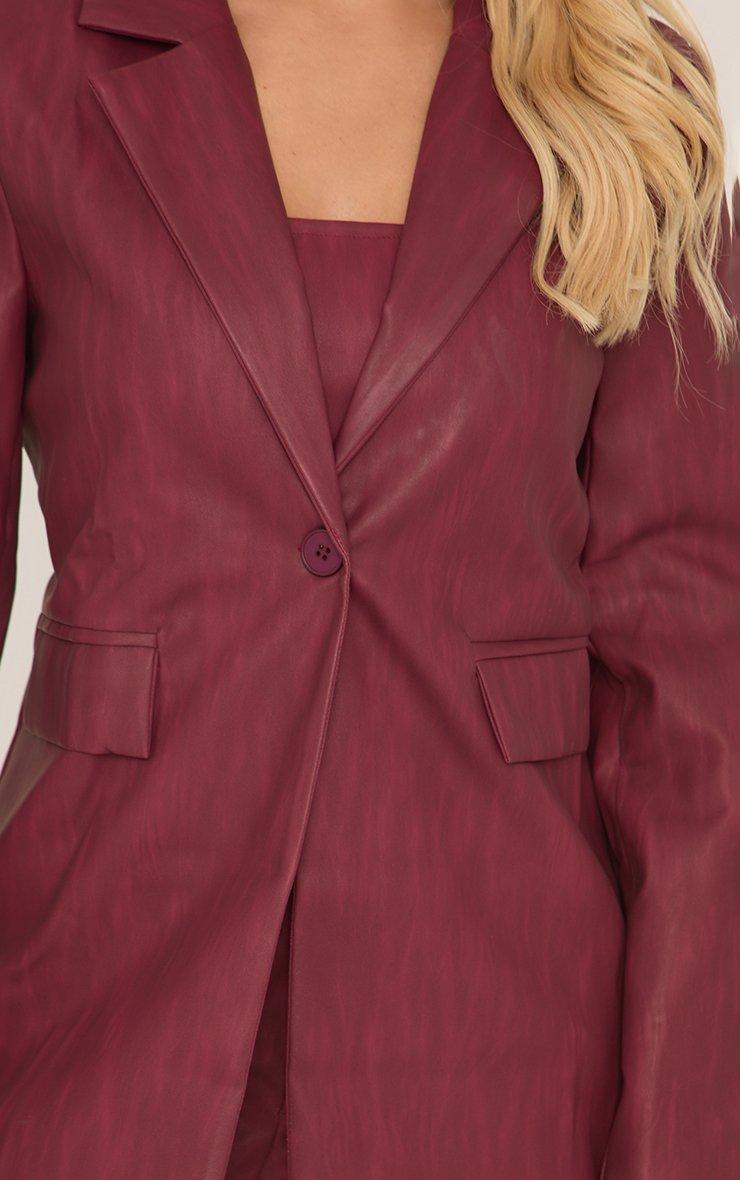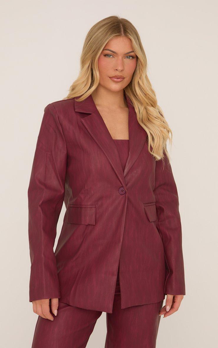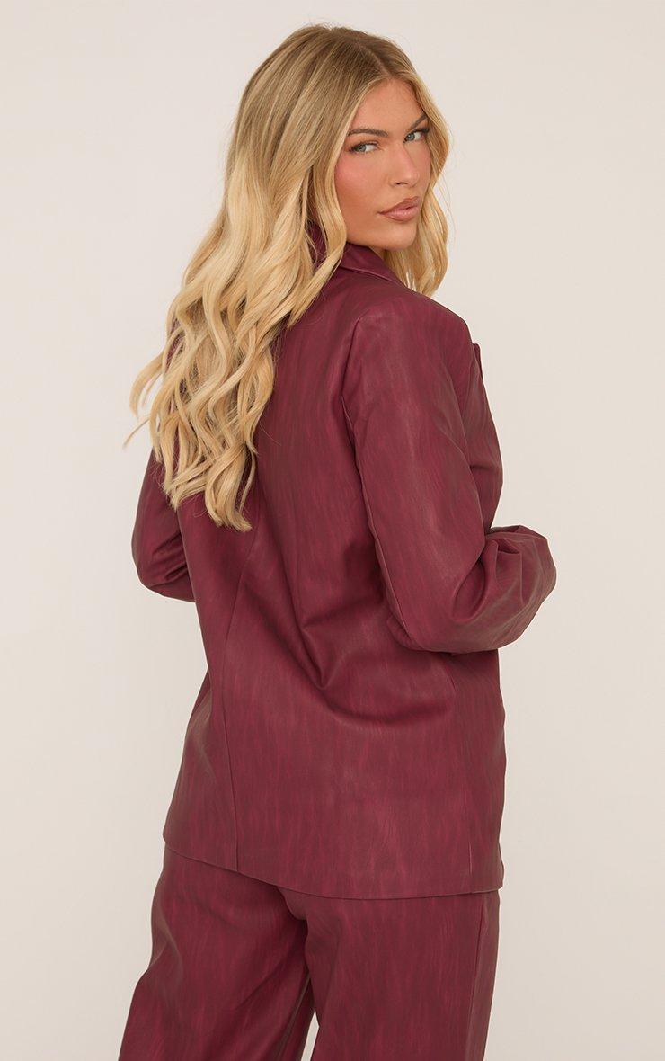 Stay on-trend in our Oversized Blazer In Washed Burgundy Faux Leather. This burgundy faux leather blazer is bold and edgy with its oversized fit and washed finish. Style this oversized blazer with the matching trousers for sassy styling!