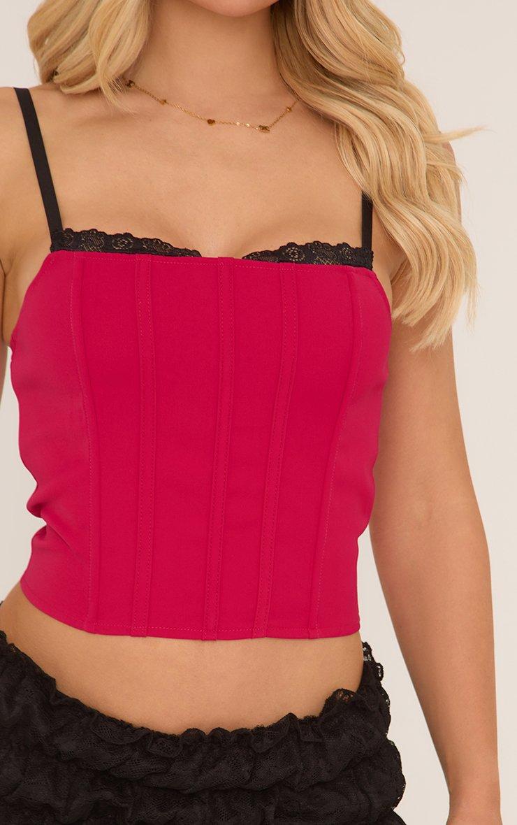 Square Neck Contrast Lace Trim Corset Top In Red Woven
