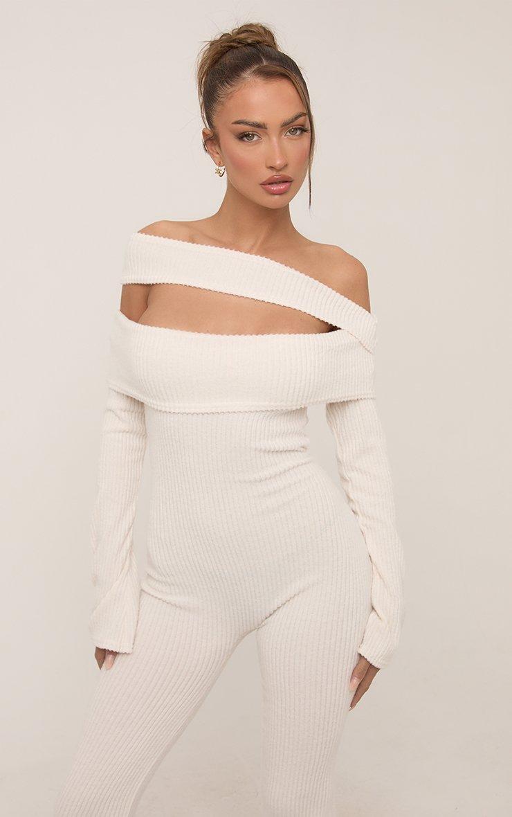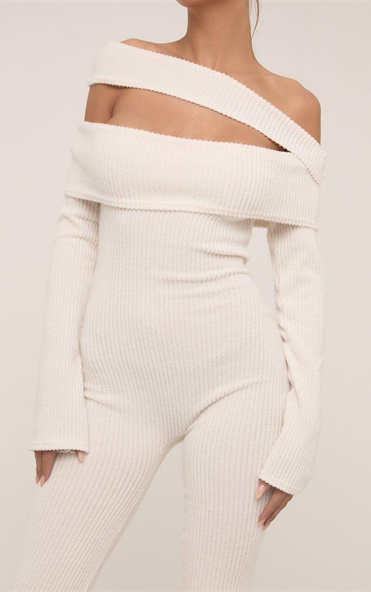 Asymmetric Fold Over Bardot Flared Leg Jumpsuit In Cream Cotton Rib