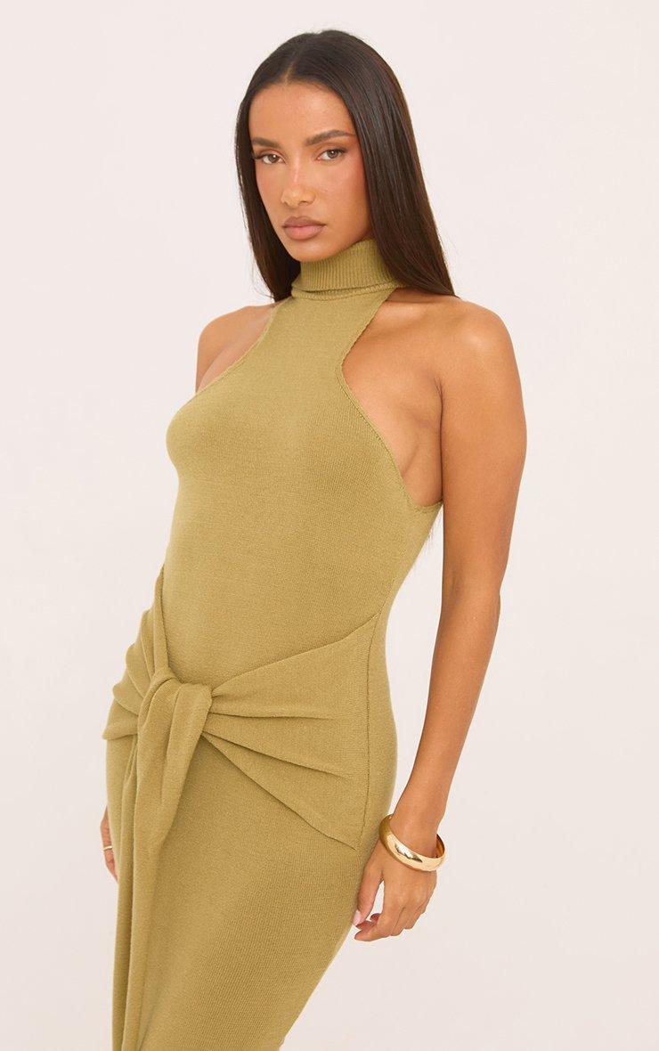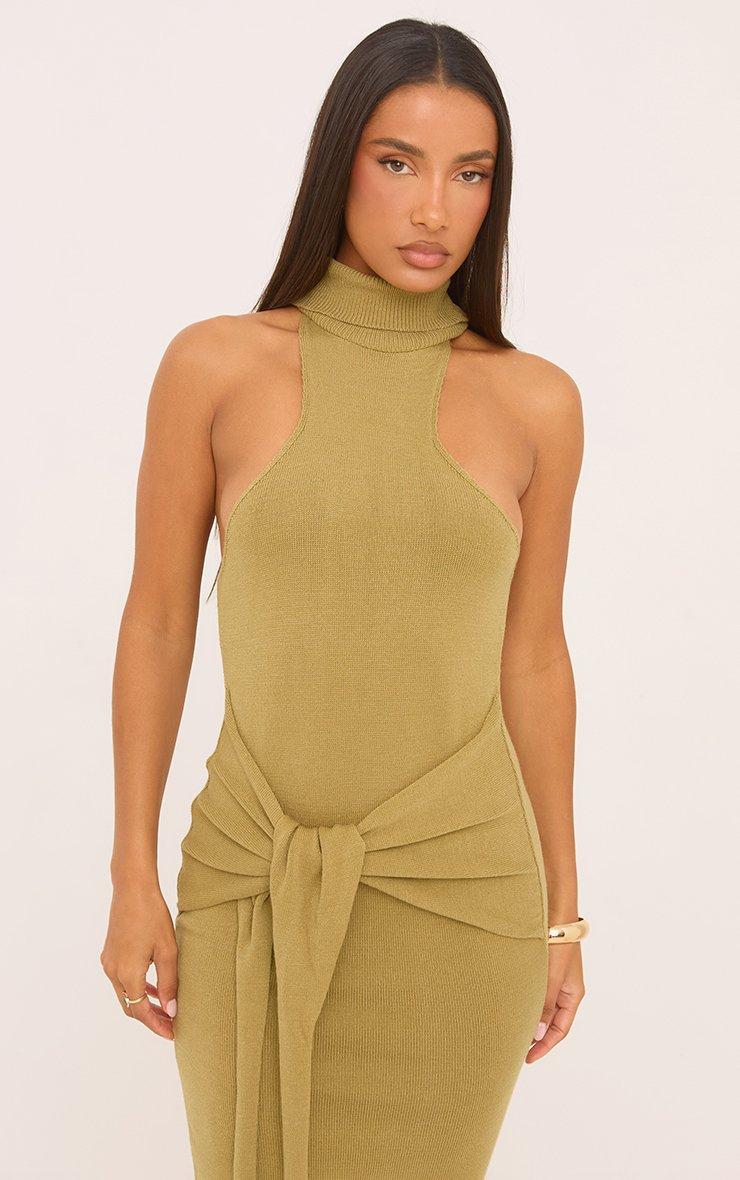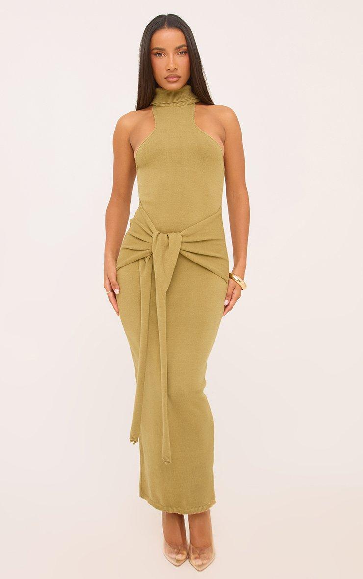 High Neck Tie Waist Sleeveless Maxi Dress In Olive Green Knit