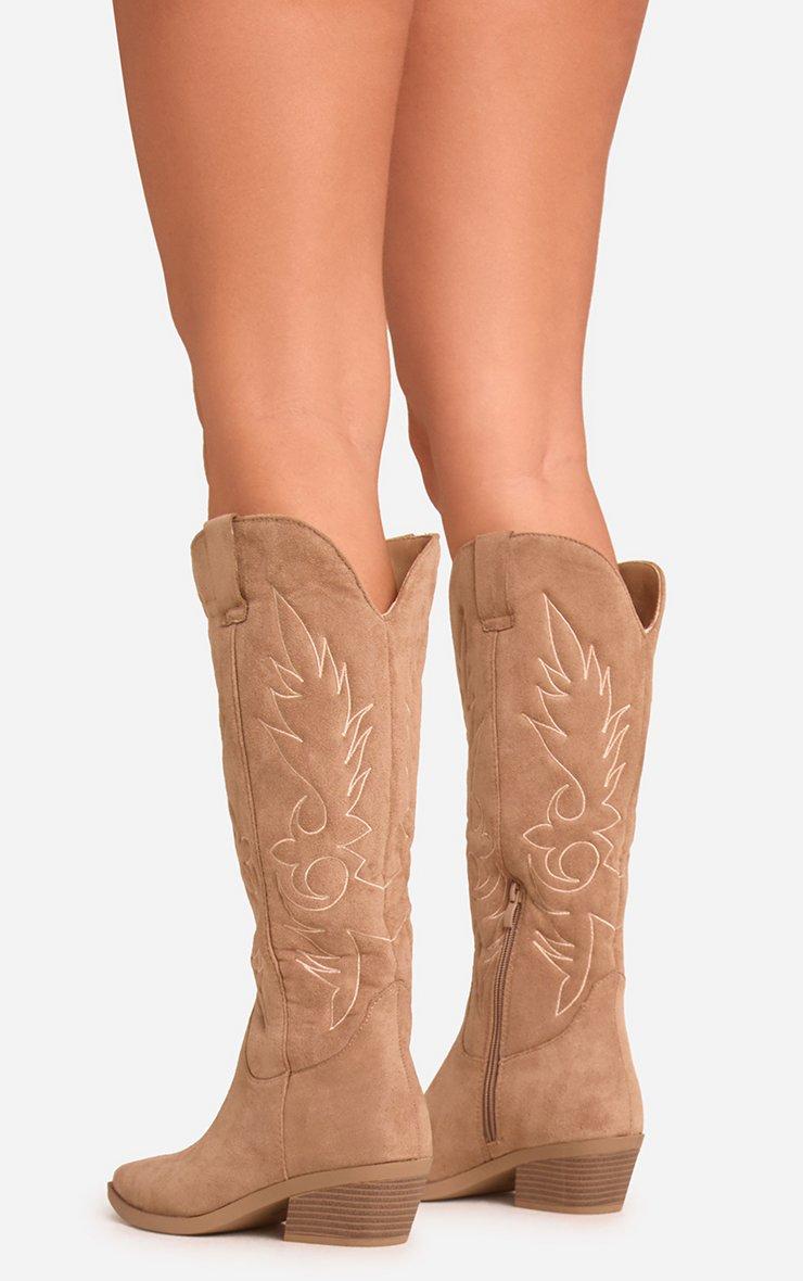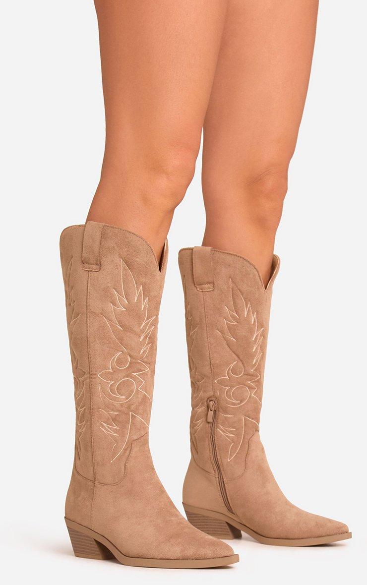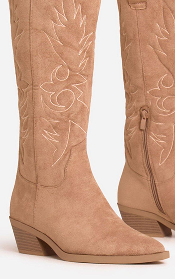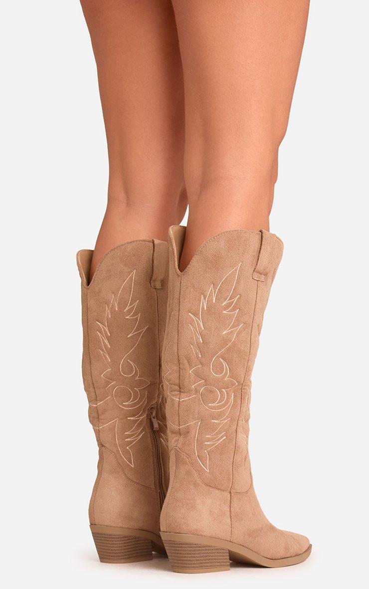 Cause serious shoe envy with the Tara Embroidered Detail Pointed Toe Knee High Long Western Cowboy Boot in Taupe Faux Suede. These beige mid-calf cowboy boots will elevate your autumn wardrobe with their dreamy taupe faux suede and gorg embroidered details. The pointed toe and knee-high fit give classic cowboy boots a sexy EGO twist!
