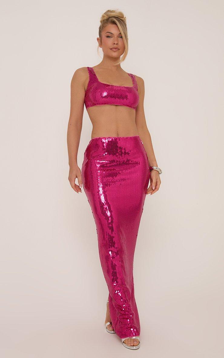 Step into sparkle season with our Square Neck Cropped Bralet Top In Pink Sequin. This pink sequin bralet was designed to dazzle with its chic square neck, cropped fit and hot pink sequins. Style this bralet with the matching sequin skirt for an unforgettable party fit!
