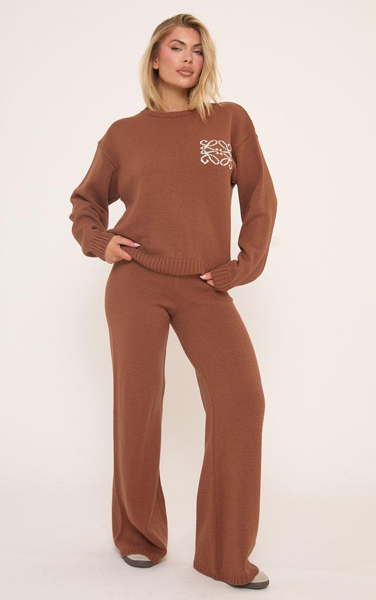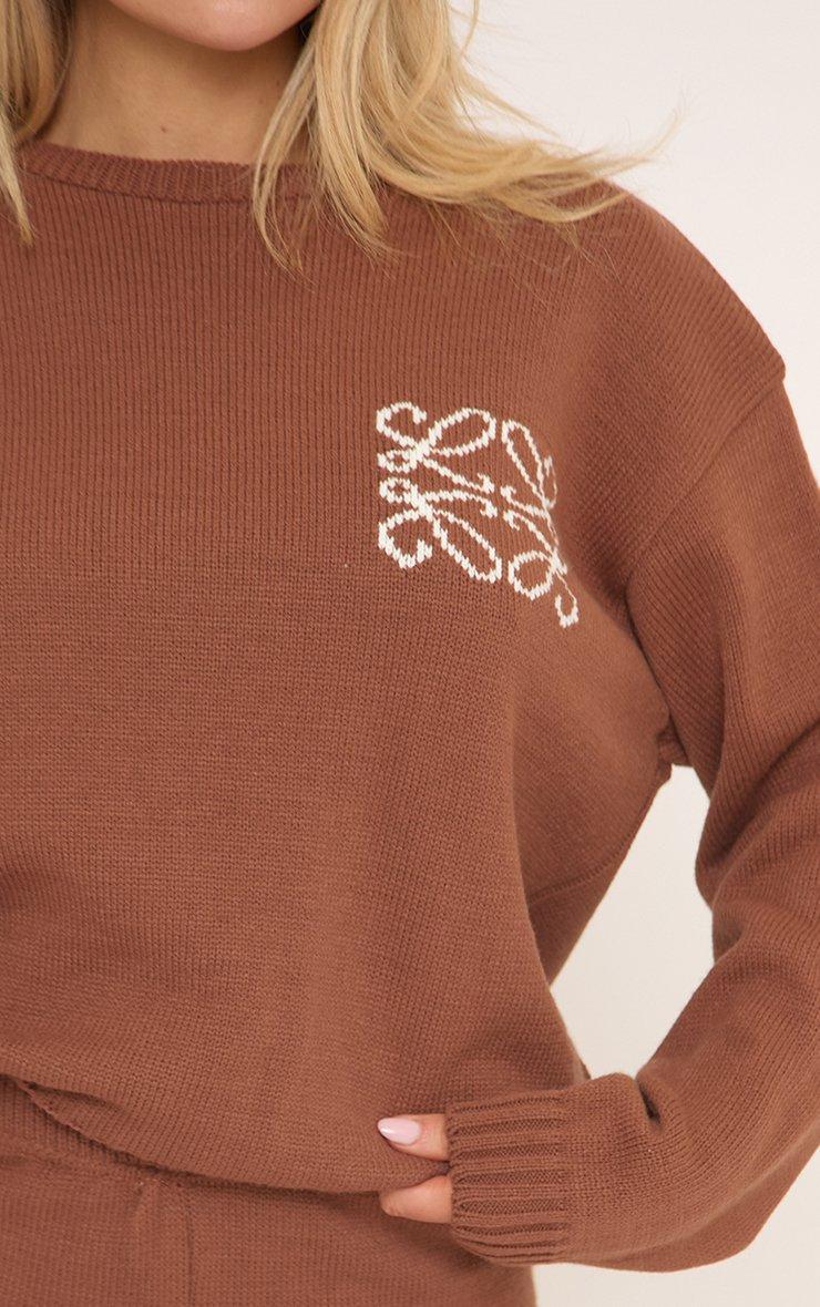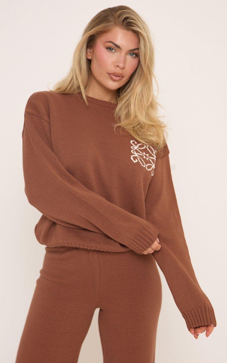 Long Sleeve Swirl Detail Oversized Jumper In Brown Knit
