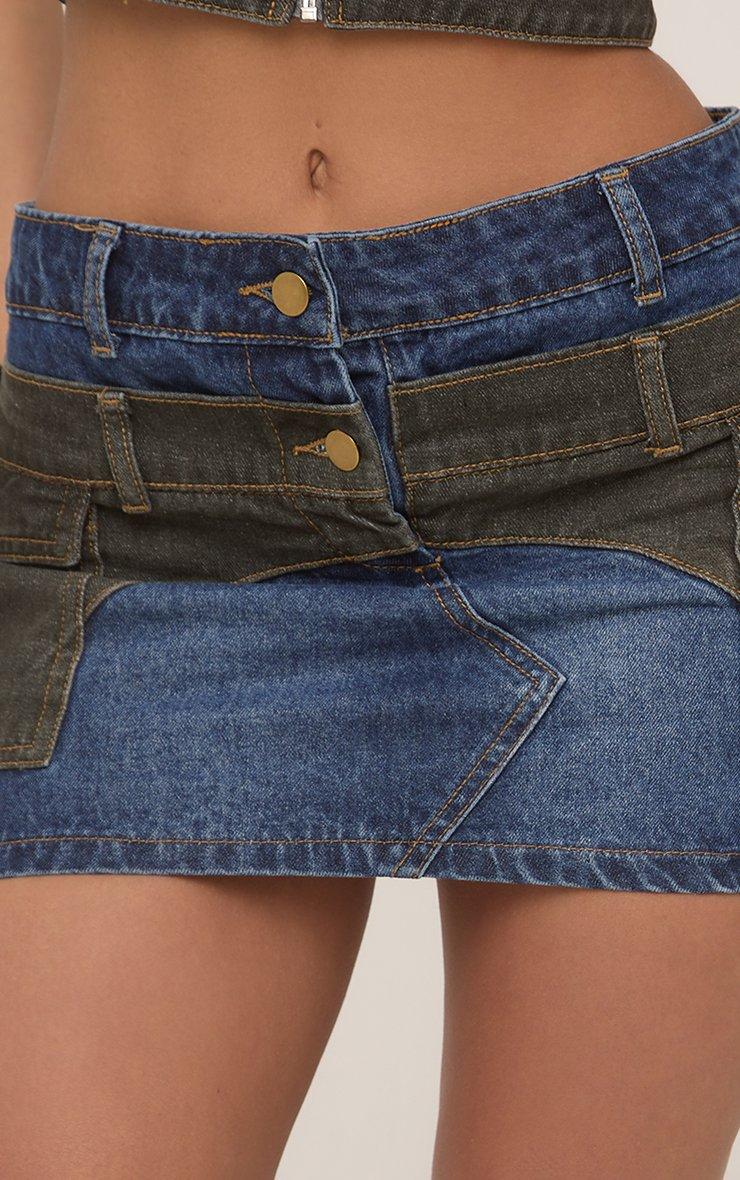 This skirt is serving all the cool-girl vibes, doll! Featuring blue denim with a low-rise fit, double waistband, and cargo detailing, it’s the perfect mix of edgy and chic—ideal for making a bold statement.