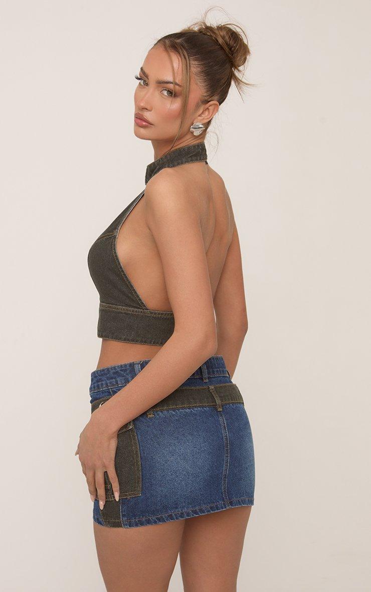 Low Rise Double Waistband Cargo Mini Skirt In Blue Denim