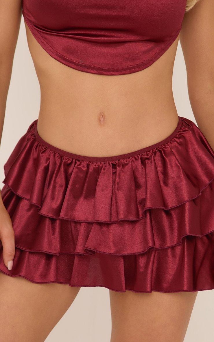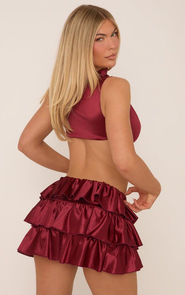 Low Rise Ruffle Mini Skirt In Burgundy Slinky Satin