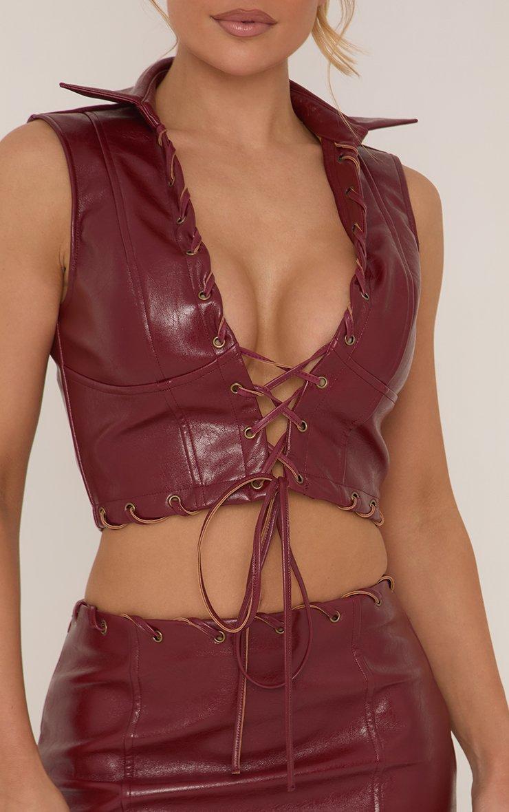 Plunge Neck Lace Up Front Collared Crop Top In Burgundy Faux Leather