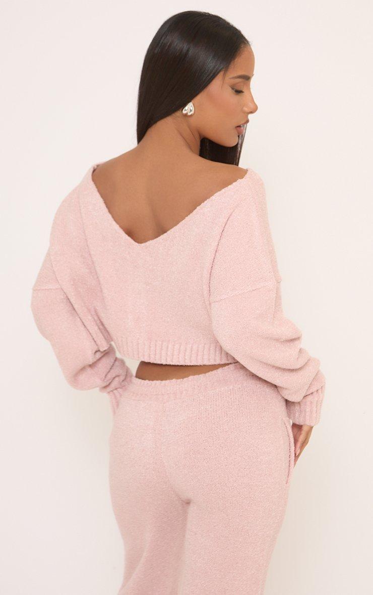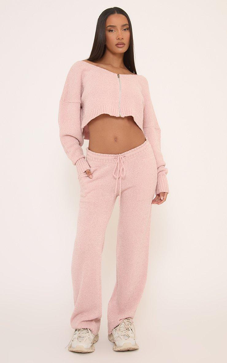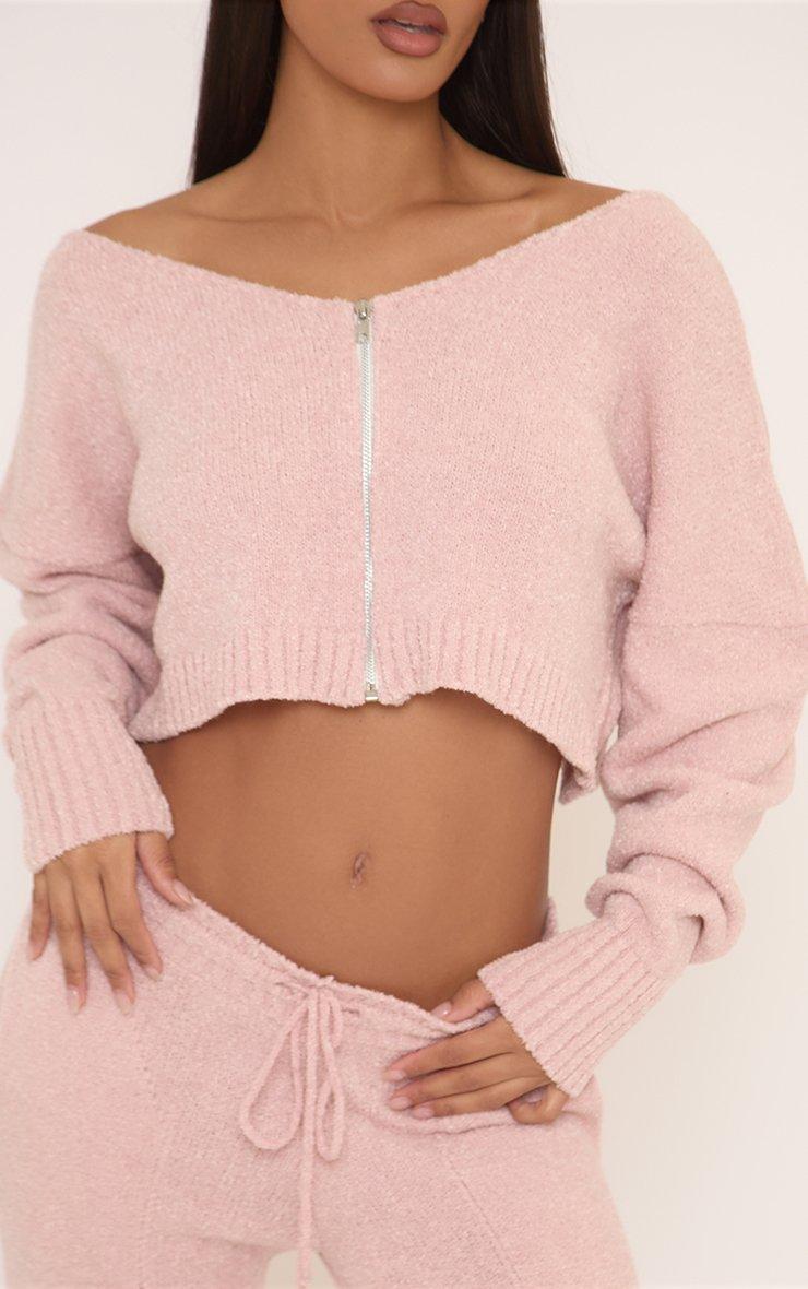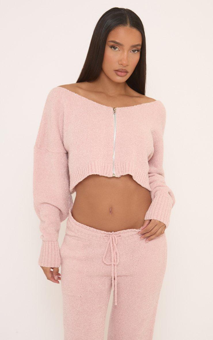 Long Sleeve Zip Up Off The Shoulder Cropped Jacket In Pink Fluffy Knit