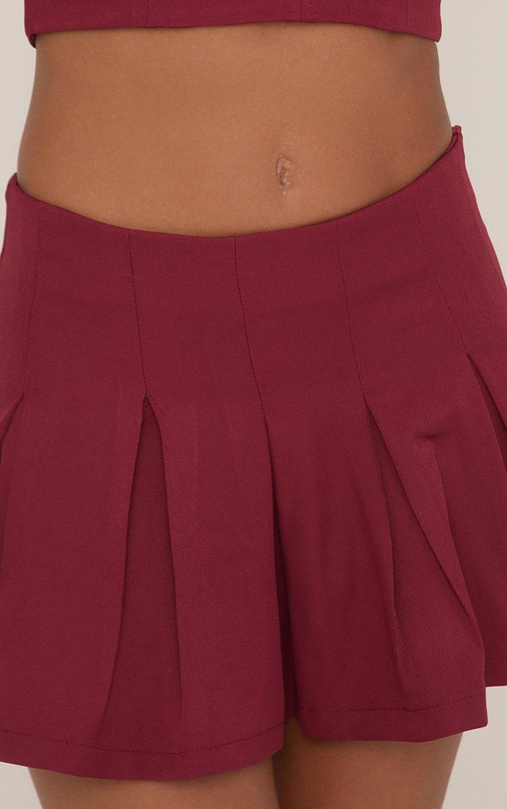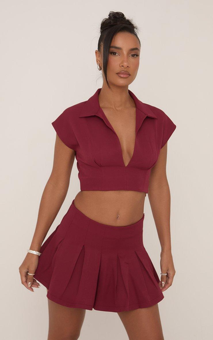 Mid Rise Tailored Pleated Mini Skirt In Burgundy Woven